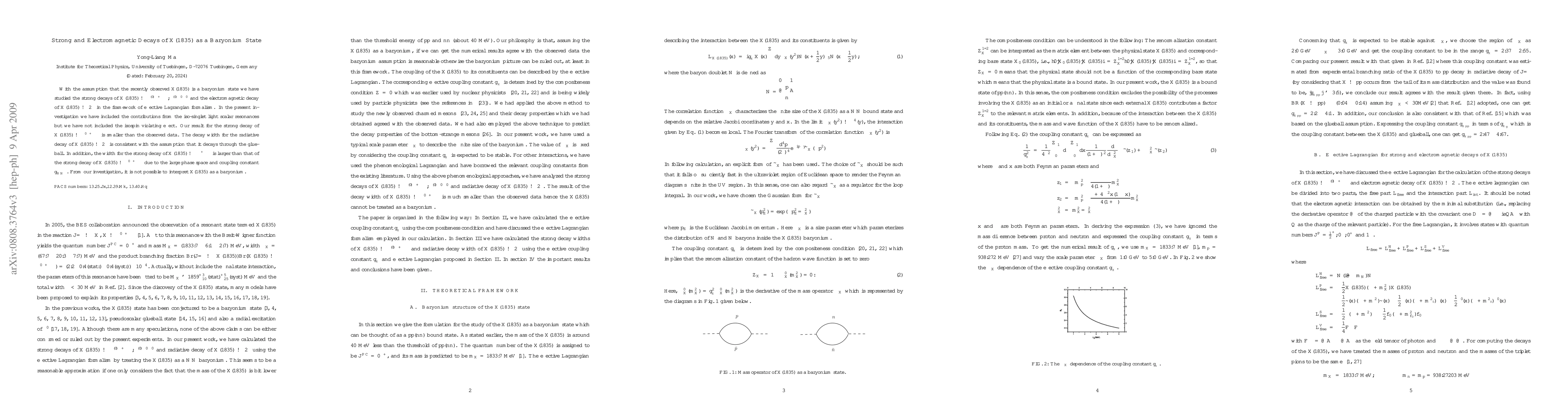 With the assumption that the recently observed X(1835) is a baryonium state we have studied the strong decays of $X(1835) \to \eta^{(\prime)} \pi^+ \pi^-, \eta^{(\prime)} \pi^0 \pi^0$ and the electromagnetic decay of $X(1835) \to 2\gamma$ in the framework of effective Lagrangian formalism. In the present investigation we have included the contributions from the iso-singlet light scalar resonances but we have not included the isospin violating effect. Our result for the strong decay of $X(1835) \to \eta^{\prime} \pi^+ \pi^-$ is smaller than the observed data. The decay width for the radiative decay of $X(1835) \to 2\gamma$ is consistent with the assumption that it decays through the glueball. In addition, the width for the strong decay of $X(1835) \to \eta \pi^+ \pi^-$ is larger than that of the strong decay of $X(1835) \to \eta^{\prime} \pi^+ \pi^-$ due to the large phase space and coupling constant $g_{N\bar{N}\eta}$. From our investigation, it is not possible to interpret X(1835) as a baryonium.