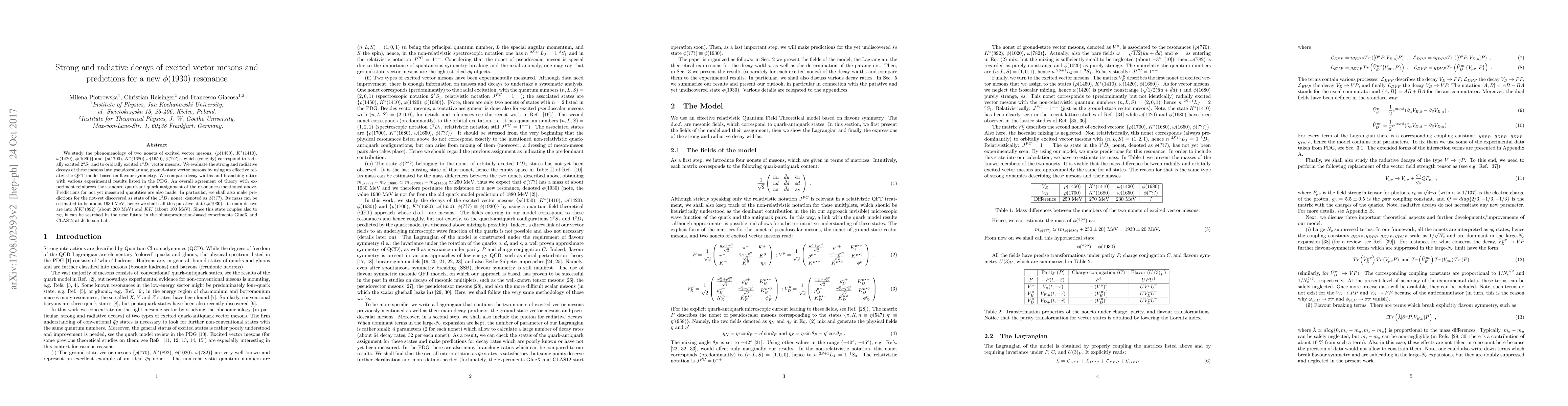 This paper investigates the strong and radiative decays of excited vector mesons using an effective relativistic QFT model, finding good agreement with experimental results and predicting the properties of a new $\phi(1930)$ resonance, which is expected to decay mainly into $KK^{\ast}(892)$ and $KK$ states. The resonance may be detected in future photoproduction experiments.