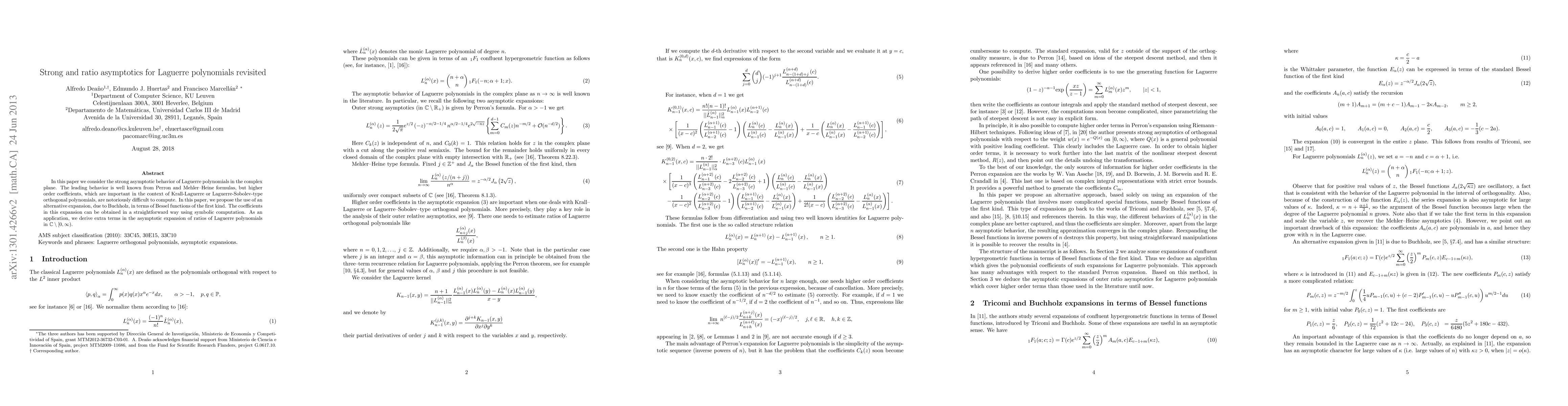 This paper investigates the strong asymptotic behavior of Laguerre polynomials, focusing on higher-order coefficients that are challenging to compute. It proposes an alternative expansion using Bessel functions, allowing for easier symbolic computation of coefficients, and derives additional terms in the asymptotic expansion of ratios of Laguerre polynomials.