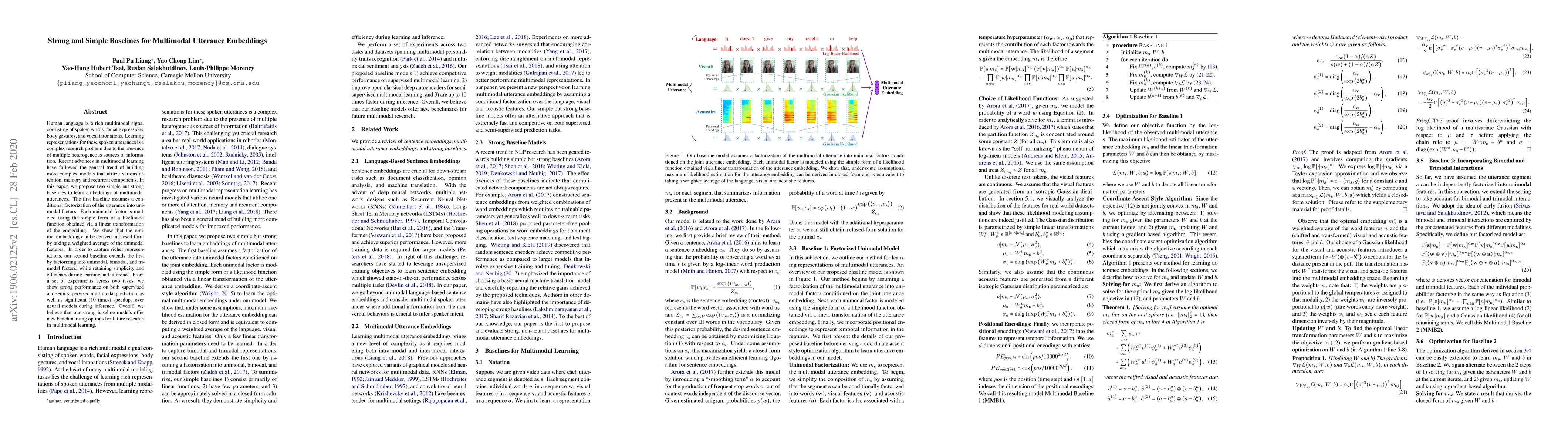 Human language is a rich multimodal signal consisting of spoken words, facial expressions, body gestures, and vocal intonations. Learning representations for these spoken utterances is a complex research problem due to the presence of multiple heterogeneous sources of information. Recent advances in multimodal learning have followed the general trend of building more complex models that utilize various attention, memory and recurrent components. In this paper, we propose two simple but strong baselines to learn embeddings of multimodal utterances. The first baseline assumes a conditional factorization of the utterance into unimodal factors. Each unimodal factor is modeled using the simple form of a likelihood function obtained via a linear transformation of the embedding. We show that the optimal embedding can be derived in closed form by taking a weighted average of the unimodal features. In order to capture richer representations, our second baseline extends the first by factorizing into unimodal, bimodal, and trimodal factors, while retaining simplicity and efficiency during learning and inference. From a set of experiments across two tasks, we show strong performance on both supervised and semi-supervised multimodal prediction, as well as significant (10 times) speedups over neural models during inference. Overall, we believe that our strong baseline models offer new benchmarking options for future research in multimodal learning.