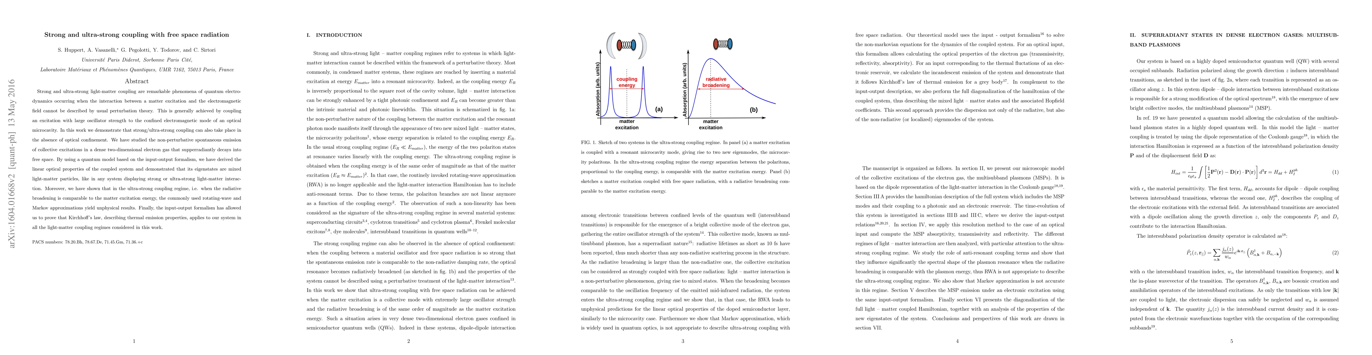 Strong and ultra-strong light-matter coupling are remarkable phenomena of quantum electrodynamics occurring when the interaction between a matter excitation and the electromagnetic field cannot be described by usual perturbation theory. This is generally achieved by coupling an excitation with large oscillator strength to the confined electromagnetic mode of an optical microcavity. In this work we demonstrate that strong/ultra-strong coupling can also take place in the absence of optical confinement. We have studied the non-perturbative spontaneous emission of collective excitations in a dense two-dimensional electron gas that superradiantly decays into free space. By using a quantum model based on the input-output formalism, we have derived the linear optical properties of the coupled system and demonstrated that its eigenstates are mixed light-matter particles, like in any system displaying strong or ultra-strong light-matter interaction. Moreover, we have shown that in the ultra-strong coupling regime, i.e. when the radiative broadening is comparable to the matter excitation energy, the commonly used rotating-wave and Markov approximations yield unphysical results. Finally, the input-output formalism has allowed us to prove that Kirchhoff's law, describing thermal emission properties, applies to our system in all the light-matter coupling regimes considered in this work.