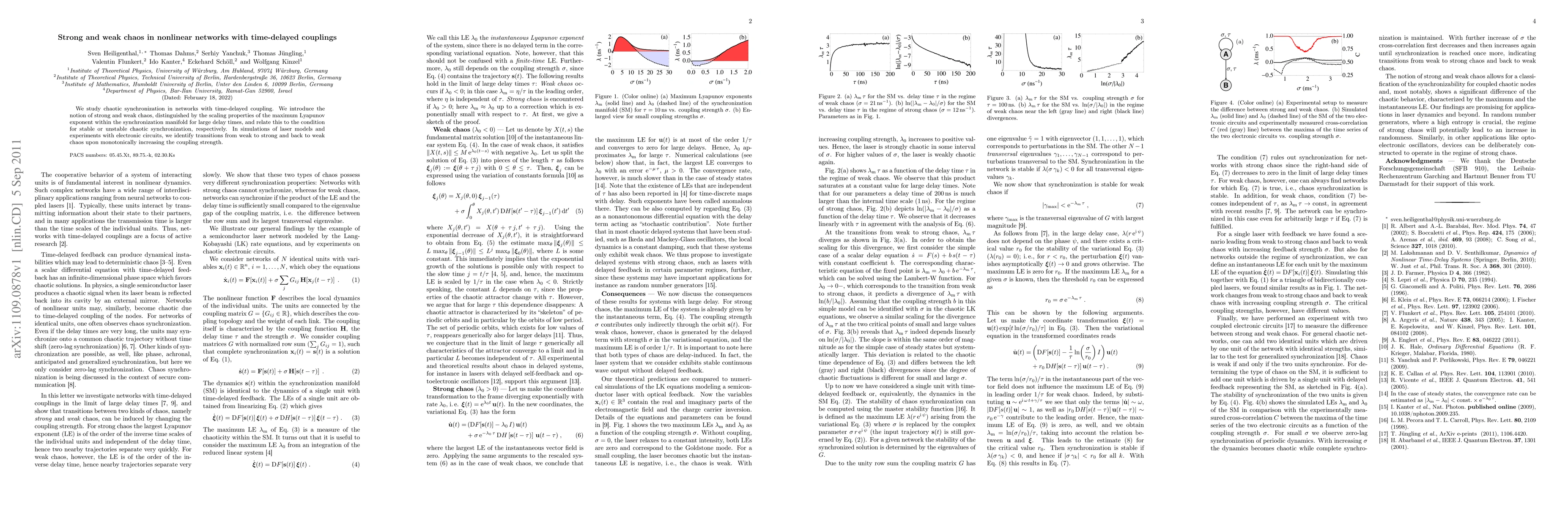 This paper explores chaotic synchronization in networks with time-delayed couplings, introducing the concepts of strong and weak chaos based on the scaling of the maximum Lyapunov exponent. It identifies transitions between these chaos types in laser models and electronic circuits as coupling strength changes.