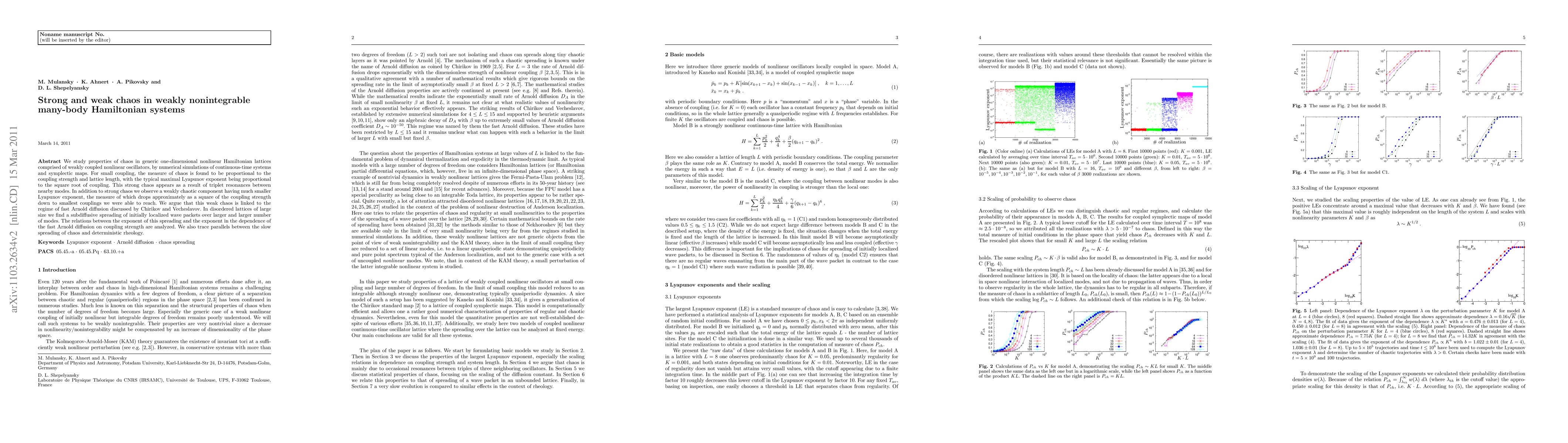 This paper investigates chaos in weakly nonintegrable one-dimensional Hamiltonian lattices, finding strong chaos proportional to the coupling strength and weak chaos linked to fast Arnold diffusion. The study reveals a subdiffusive spreading of wave packets and parallels with deterministic rheology.