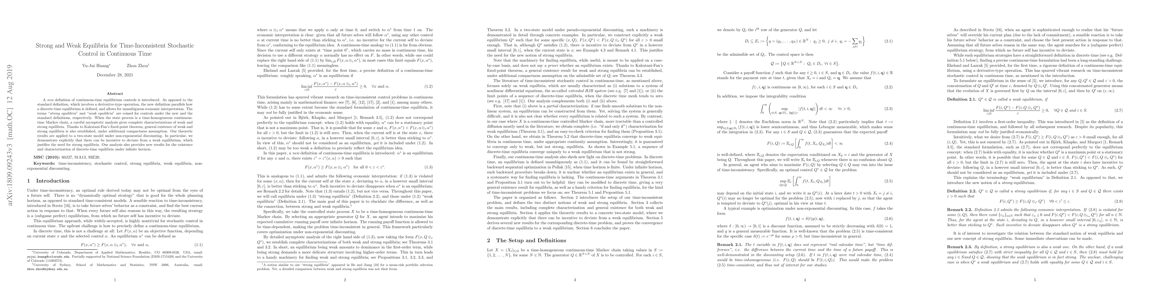 This paper introduces 'strong' and 'weak' equilibrium controls in continuous-time stochastic control, differentiated from the standard definition. Using a Markov chain model, it provides complete characterizations and existence results, supported by Kakutani-Fan's fixed-point theorem. The findings highlight the potential for deviating from weak equilibria, justifying strong equilibria, with implications for time-inconsistent control problems.