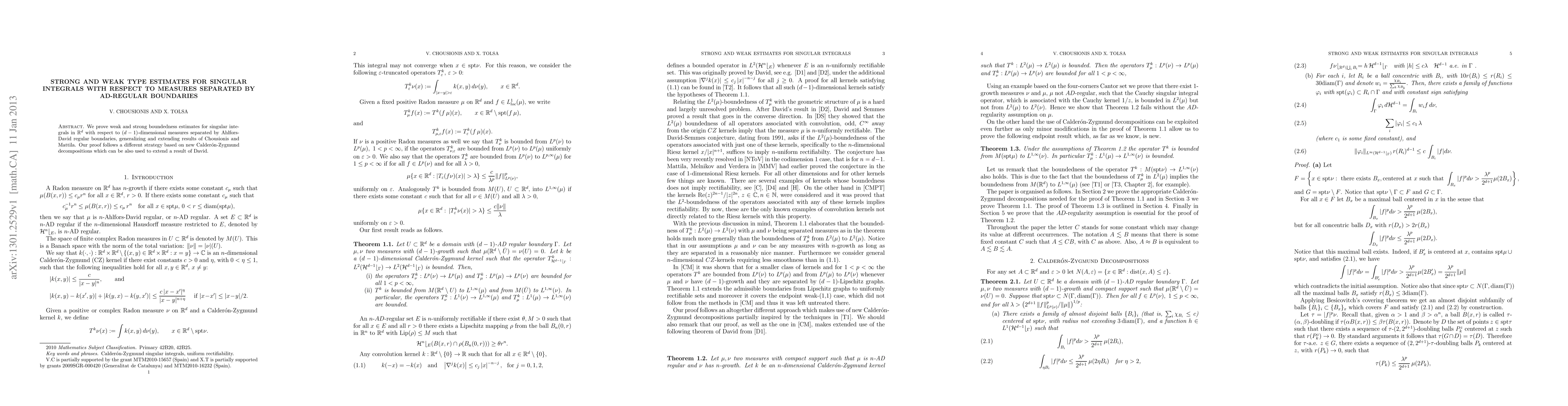 We prove weak and strong boundedness estimates for singular integrals in $\R^d$ with respect to $(d-1)$-dimensional measures separated by Ahlfors-David regular boundaries, generalizing and extending results of Chousionis and Mattila. Our proof follows a different strategy based on new Calder\'on-Zygmund decompositions which can be also used to extend a result of David.