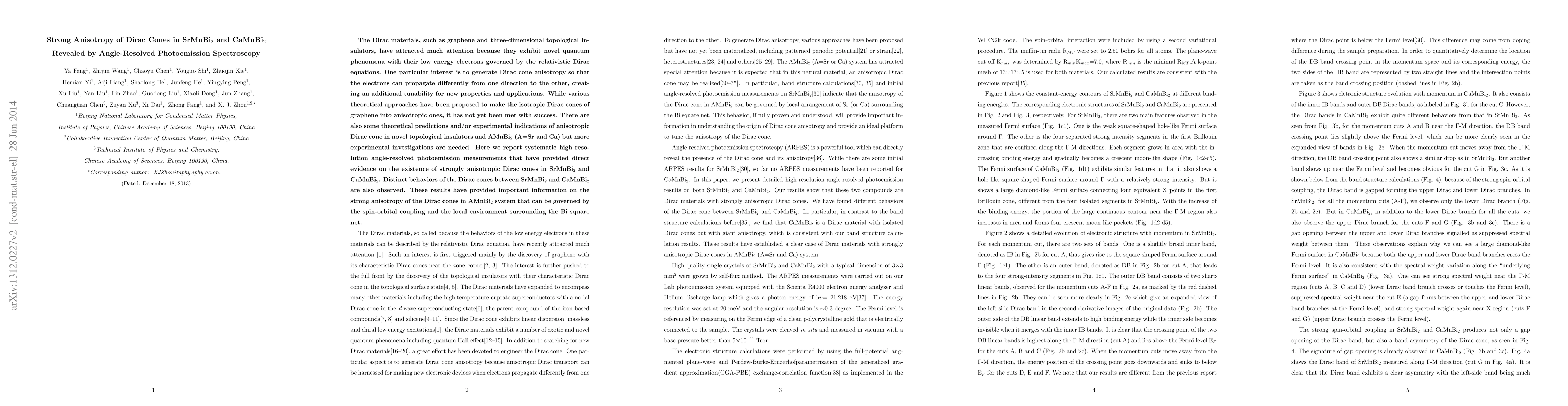 This paper uses high-resolution angle-resolved photoemission spectroscopy to reveal strong anisotropy in the Dirac cones of SrMnBi2 and CaMnBi2, providing direct evidence of distinct electronic behaviors in these materials governed by spin-orbital coupling and local environment effects.