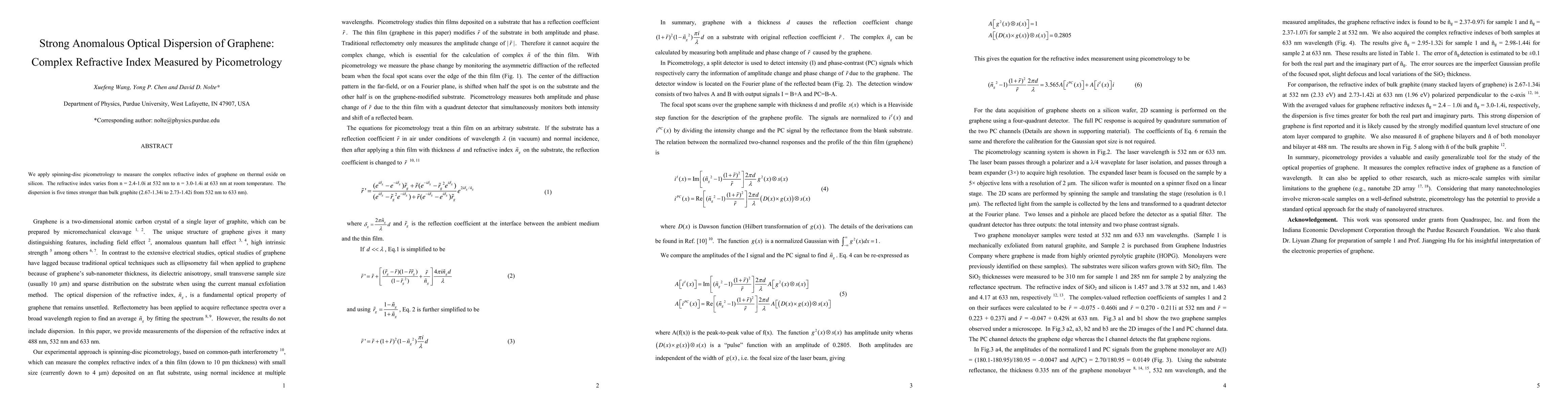 This study uses spinning-disc picometrology to measure the complex refractive index of graphene, revealing strong anomalous optical dispersion, with values ranging from n = 2.4-1.0i at 532 nm to n = 3.0-1.4i at 633 nm, five times stronger than that of bulk graphite.