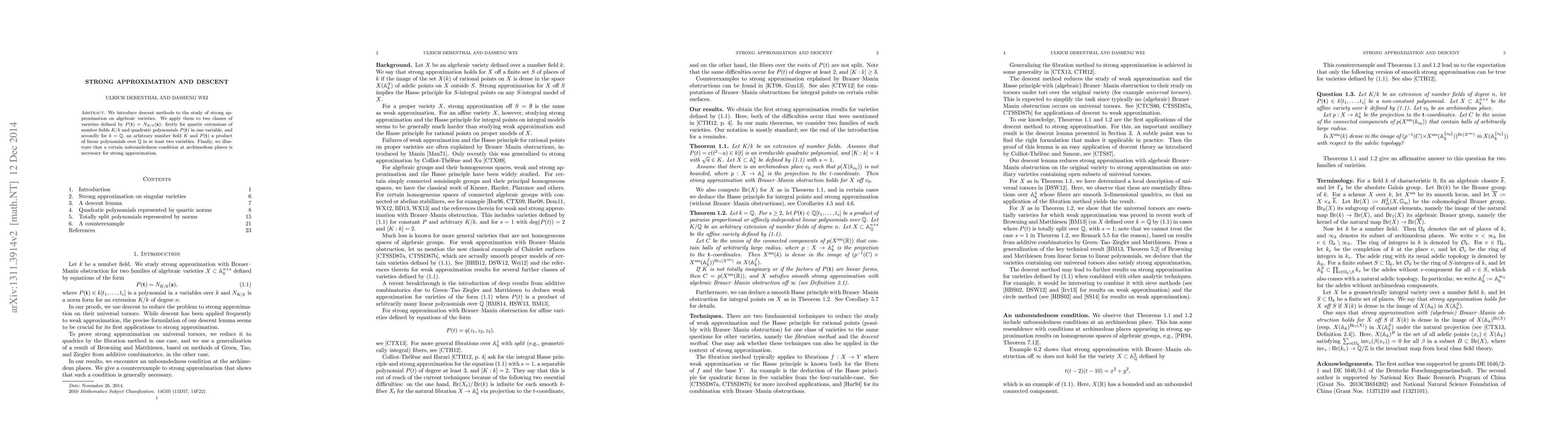 This paper develops descent methods for studying strong approximation on algebraic varieties, applying these techniques to quartic extensions and quadratic polynomials, as well as to number fields with products of linear polynomials. The study concludes that an unboundedness condition at archimedean places is essential for strong approximation.