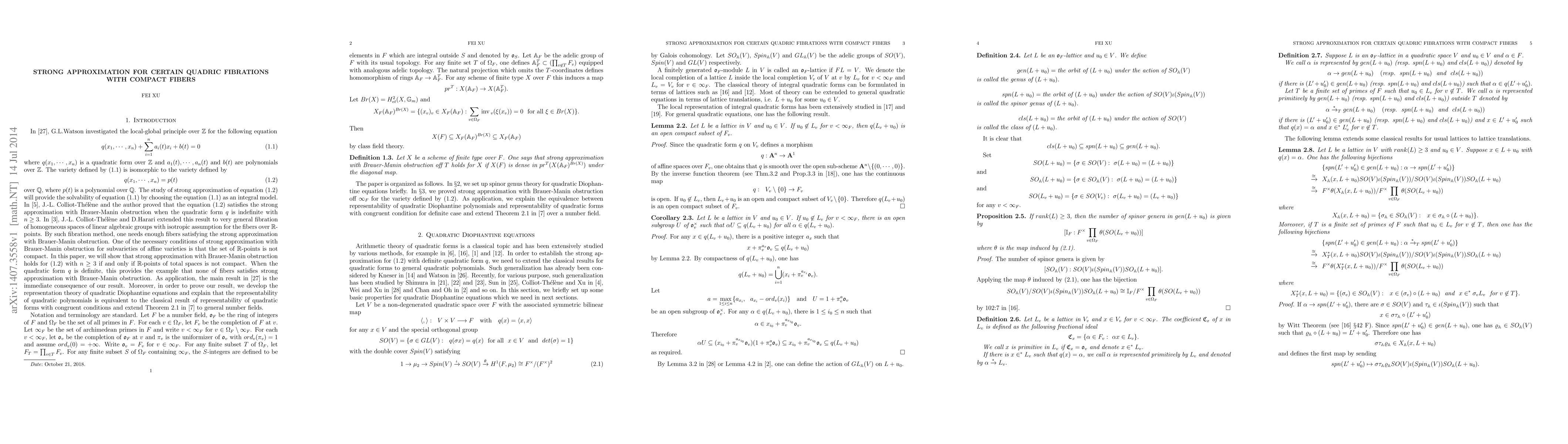 This paper demonstrates strong approximation with Brauer-Manin obstruction for specific quadratic fibrations despite none of their fibers having this property. It also advances the representation theory of quadratic Diophantine equations, linking the representability of quadratic polynomials to the classical result for quadratic forms over number fields.