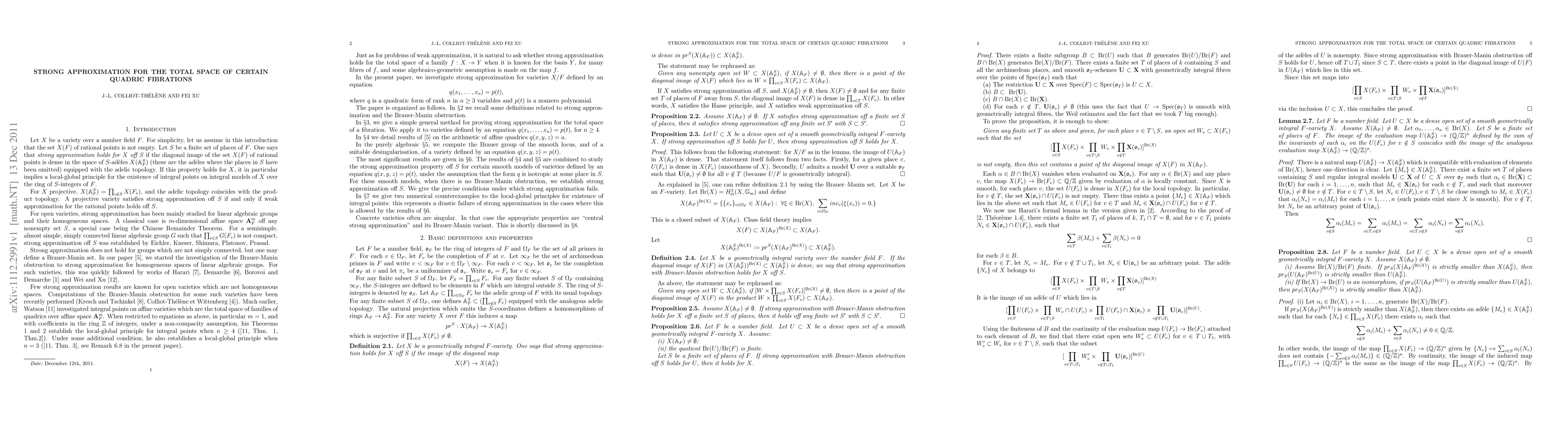 We study equations in four variables (x,y,z,t) of the shape q(x,y,z)=P(t), where q(x,y,z) is an indefinite ternary quadratic form over the integers and P(t) is a polynomial in one variable with integral coefficients. If P(t) is not the product of a constant and the square of a polynomial, strong approximation holds for integral solutions (x,y,z,t). In the general case, we show that the integral Brauer-Manin conditions are the only obstructions to strong approximation. We actually study the analogous situation over an arbitrary number field. --- Nous \'etudions les \'equations \`a quatre variables (x,y,z,t) \`a coefficients entiers du type q(x,y,z)=P(t), o\`u q(x,y,z) est une forme quadratique enti\`ere ternaire ind\'efinie sur les r\'eels, et P(t) un polyn\^ome \`a coefficients entiers en une variable. Lorsque le polyn\^ome n'est pas le produit d'une constante et d'un carr\'e de polyn\^ome, nous \'etablissons l'approximation forte pour les solutions de ces \'equations en entiers (x,y,z,t). Dans le cas g\'en\'eral, nous montrons que l'obstruction de Brauer-Manin enti\`ere est la seule obstruction \`a l'approximation forte. Nous \'etudions la situation sur un corps de nombres quelconque.