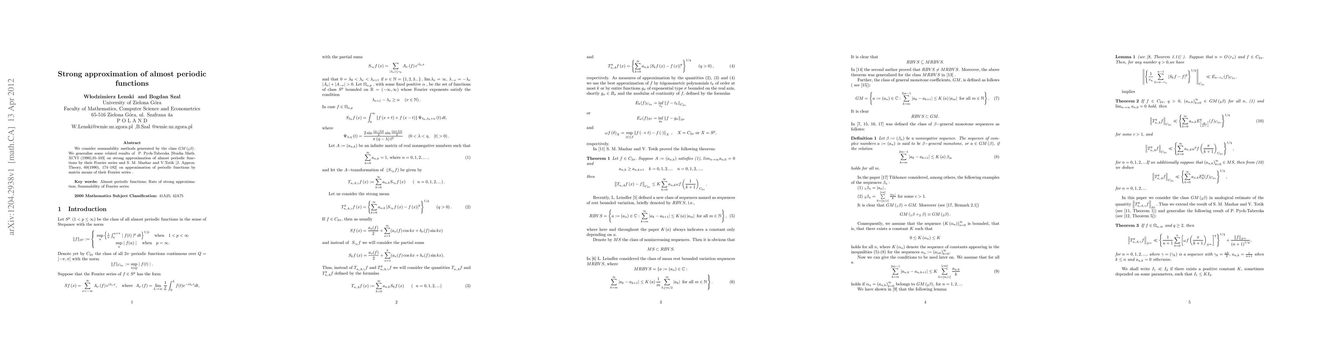 The paper utilizes summability methods generated by the class GM(2b) to generalize results on strong approximation of almost periodic functions by their Fourier series, building upon previous works by P. Pych-Taberska and S. M. Mazhar and V. Totik.