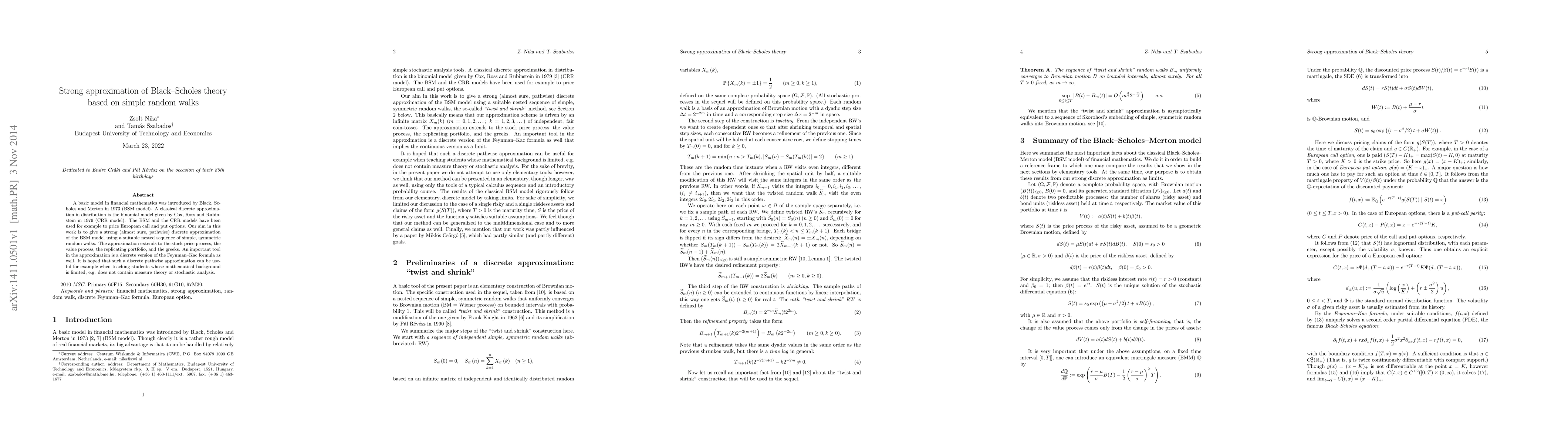 A basic model in financial mathematics was introduced by Black, Scholes and Merton in 1973 (BSM model). A classical discrete approximation in distribution is the binomial model given by Cox, Ross and Rubinstein in 1979 (CRR model). The BSM and the CRR models have been used for example to price European call and put options. Our aim in this work is to give a strong (almost sure, pathwise) discrete approximation of the BSM model using a suitable nested sequence of simple, symmetric random walks. The approximation extends to the stock price process, the value process, the replicating portfolio, and the greeks. An important tool in the approximation is a discrete version of the Feynman--Kac formula as well. It is hoped that such a discrete pathwise approximation can be useful for example when teaching students whose mathematical background is limited, e.g. does not contain measure theory or stochastic analysis.