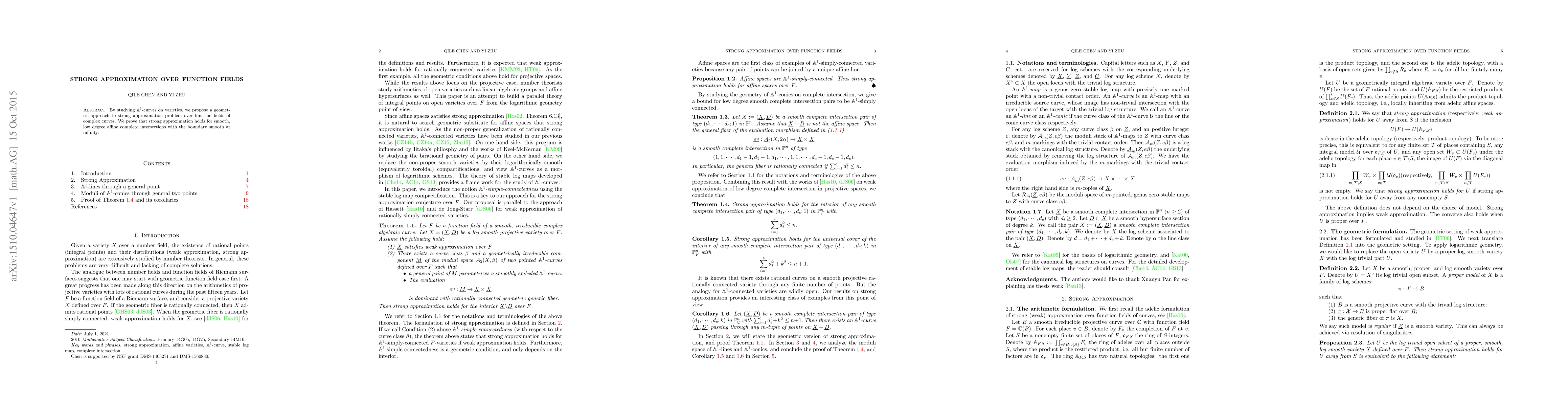 Summary: This paper introduces a geometric approach to the strong approximation problem over function fields using $\mathbb{A}^1$-curves on varieties, proving that strong approximation holds for smooth, low degree affine complete intersections with smooth boundary at infinity.