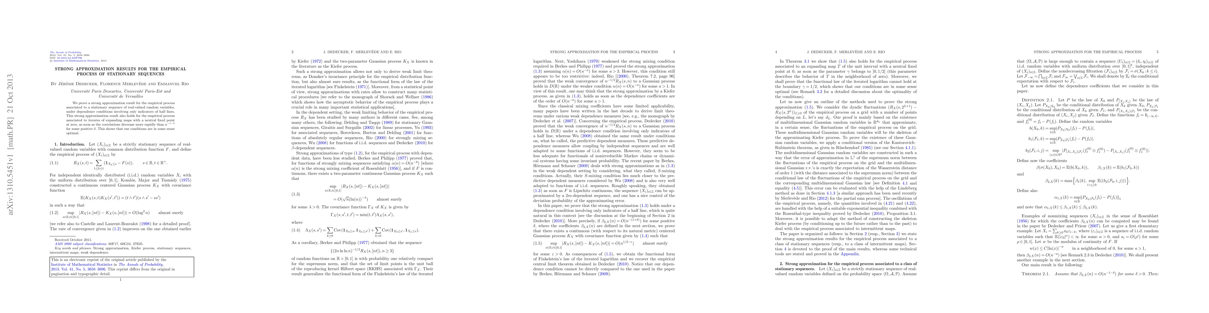 We prove a strong approximation result for the empirical process associated to a stationary sequence of real-valued random variables, under dependence conditions involving only indicators of half lines. This strong approximation result also holds for the empirical process associated to iterates of expanding maps with a neutral fixed point at zero, as soon as the correlations decrease more rapidly than $n^{-1-\delta}$ for some positive $\delta$. This shows that our conditions are in some sense optimal.