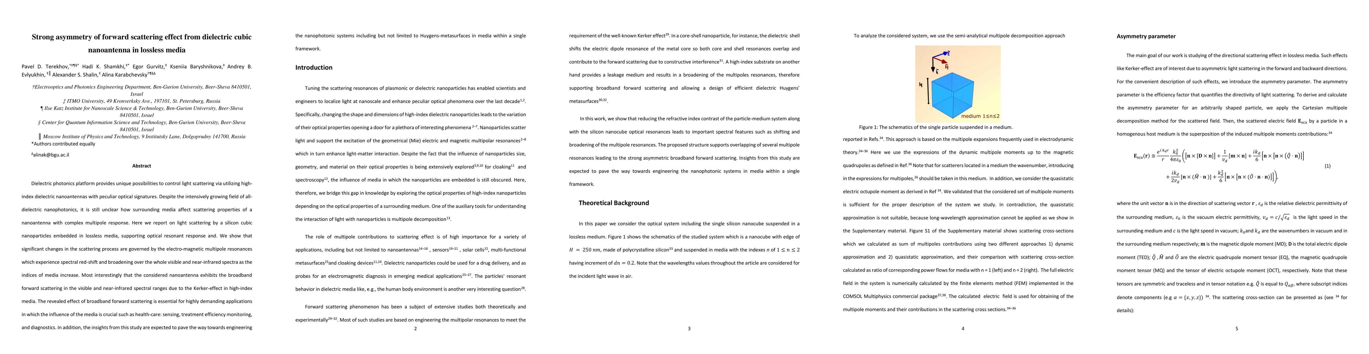 This paper investigates the forward scattering effect of silicon cubic nanoantennas in lossless media, revealing significant spectral red-shift and broadening of electromagnetic multipole resonances. The study highlights the broadband forward scattering due to the Kerker-effect, which is crucial for applications in healthcare and nanophotonic system engineering.