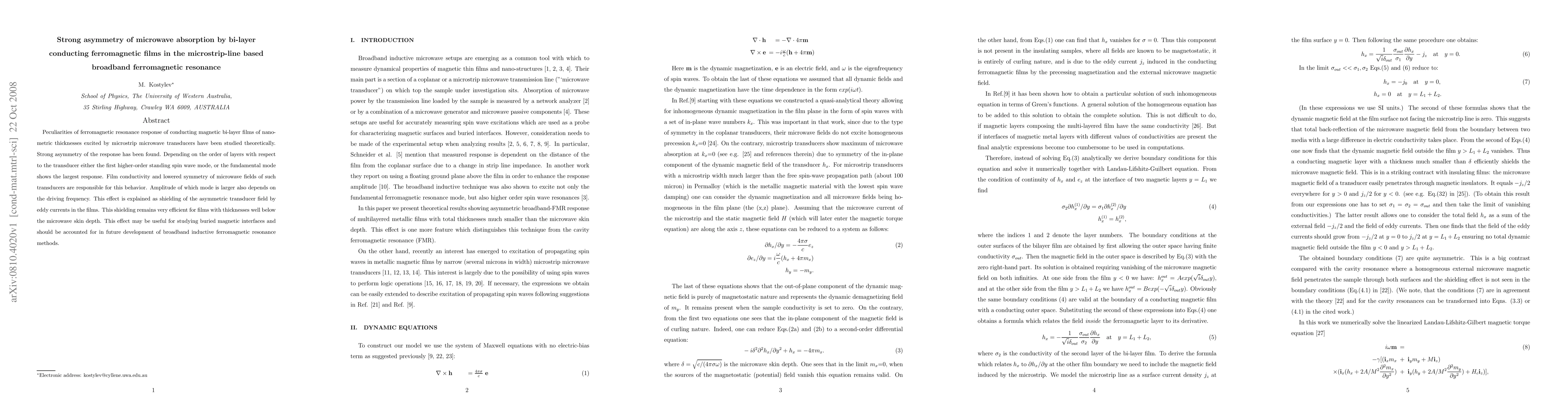 This paper explores the asymmetric microwave absorption in conducting ferromagnetic bi-layer films excited by microstrip transducers, finding that the dominant resonance mode depends on the layer order relative to the transducer and the driving frequency. The effect is attributed to shielding by eddy currents in the films.