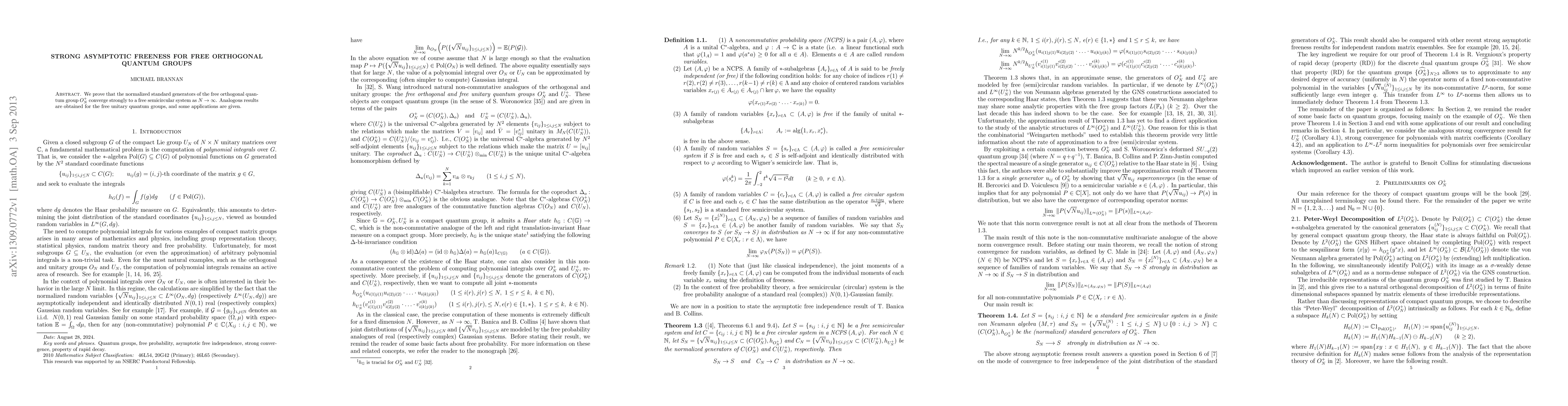 This paper demonstrates that the normalized standard generators of the free orthogonal quantum group $O_N^+$ strongly converge to a free semicircular system as $N$ approaches infinity. Similar results are shown for free unitary quantum groups, with implications for quantum group theory.