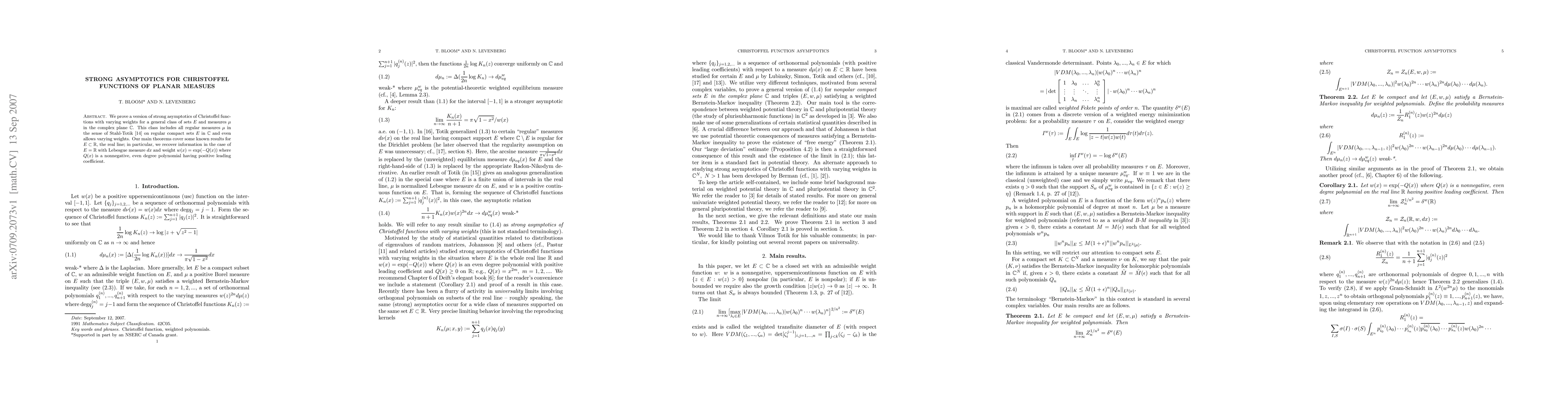 We prove a version of strong asymptotics of Christoffel functions with varying weights for a general class of sets E and measures in the complex plane. This class includes all regular measures in the sense of Stahl-Totik on regular compact sets E in the plane and even allows varying weights. Our main theorems cover some known results for subsets E of the real line R; in particular, we recover information in the case of E=R with Lebesgue measure dx and weight w(x) = exp(-Q(x)) where Q(x) is a nonnegative, even degree polynomial having positive leading coefficient.