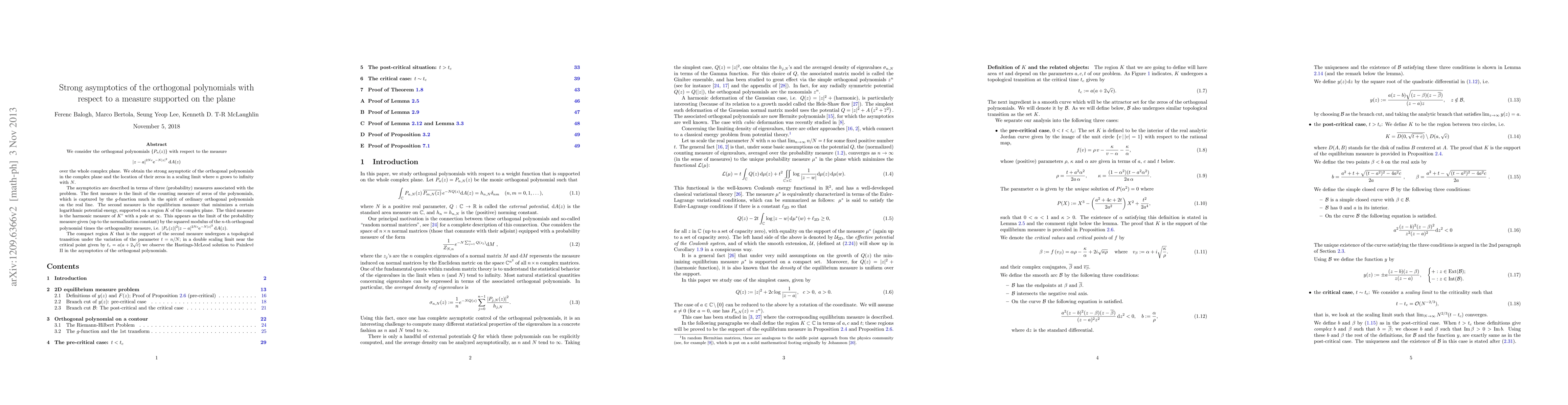 This paper investigates the strong asymptotic behavior of orthogonal polynomials defined with respect to a complex plane measure. It reveals the asymptotics in terms of three probability measures, including the limit of zeros' counting measure, an equilibrium measure, and a harmonic measure, with a notable topological transition observed near a critical parameter value.