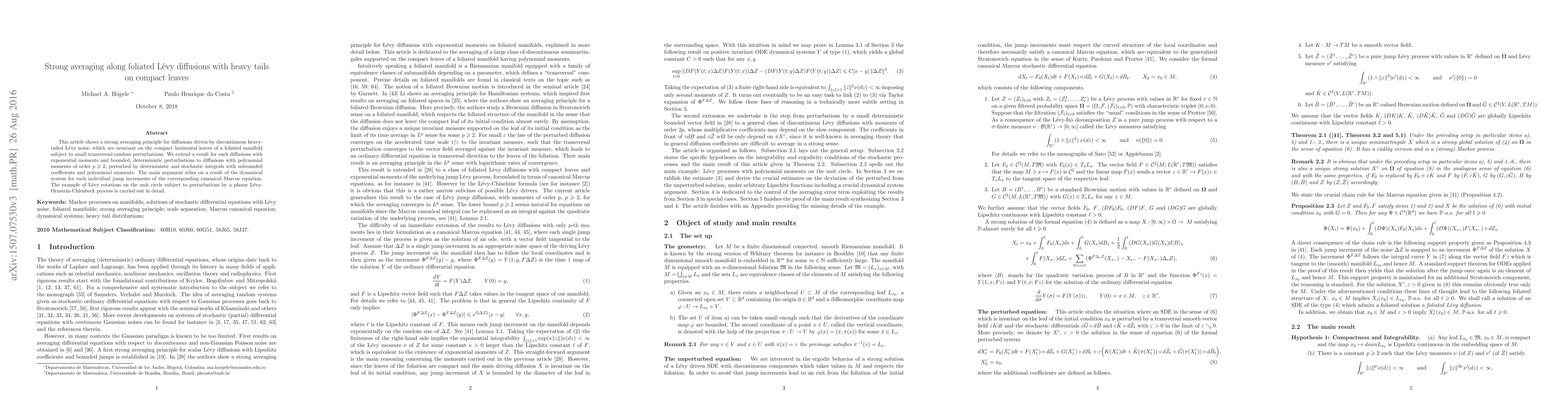 This article shows a strong averaging principle for diffusions driven by discontinuous heavy-tailed L\'evy noise, which are invariant on the compact horizontal leaves of a foliated manifold subject to small transversal random perturbations. We extend a result for such diffusions with exponential moments and bounded, deterministic perturbations to diffusions with polynomial moments of order $p\geq 2$, perturbed by deterministic and stochastic integrals with unbounded coefficients and polynomial moments. The main argument relies on a result of the dynamical system for each individual jump increments of the corresponding canonical Marcus equation. The example of L\'evy rotations on the unit circle subject to perturbations by a planar L\'evy-Ornstein-Uhlenbeck process is carried out in detail.