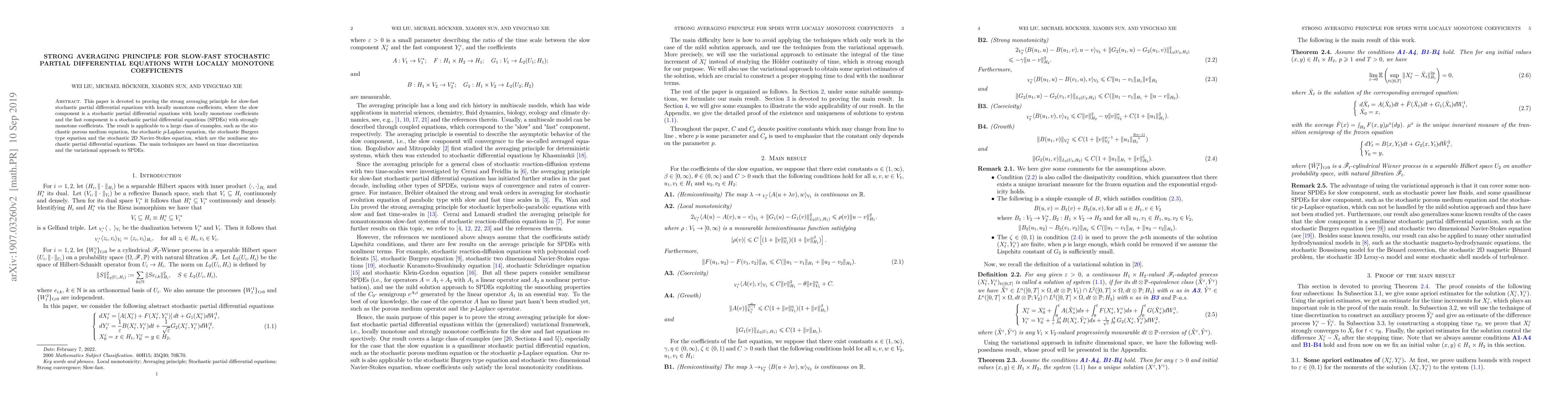 This paper proves the strong averaging principle for slow-fast stochastic partial differential equations with locally monotone coefficients, utilizing time discretization and variational methods. The results apply to various nonlinear stochastic PDEs, including the stochastic porous medium and Navier-Stokes equations.