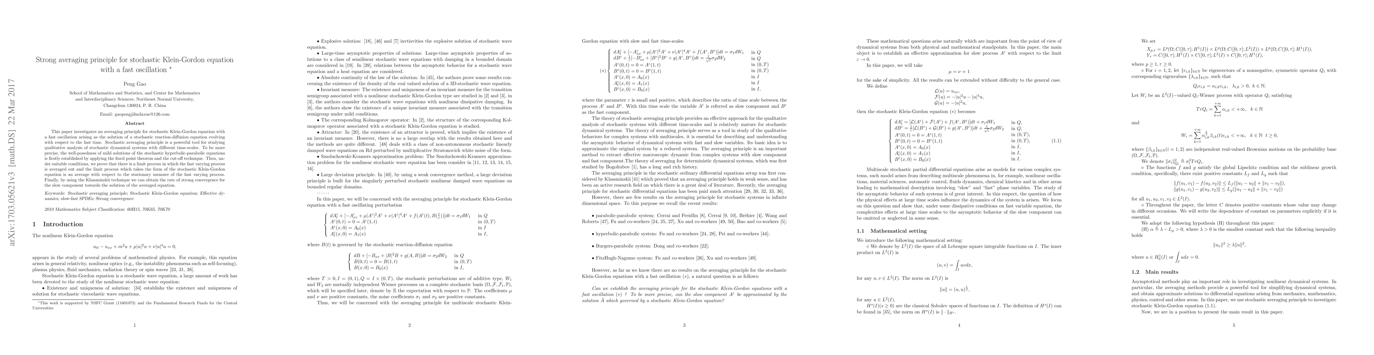 This paper investigates an averaging principle for stochastic Klein-Gordon equation with a fast oscillation arising as the solution of a stochastic reaction-diffusion equation evolving with respect to the fast time. Stochastic averaging principle is a powerful tool for studying qualitative analysis of stochastic dynamical systems with different time-scales. To be more precise, the well-posedness of mild solutions of the stochastic hyperbolic-parabolic equations is firstly established by applying the fixed point theorem and the cut-off technique. Then, under suitable conditions, we prove that there is a limit process in which the fast varying process is averaged out and the limit process which takes the form of the stochastic Klein-Gordon equation is an average with respect to the stationary measure of the fast varying process. Finally, by using the Khasminskii technique we can obtain the rate of strong convergence for the slow component towards the solution of the averaged equation.