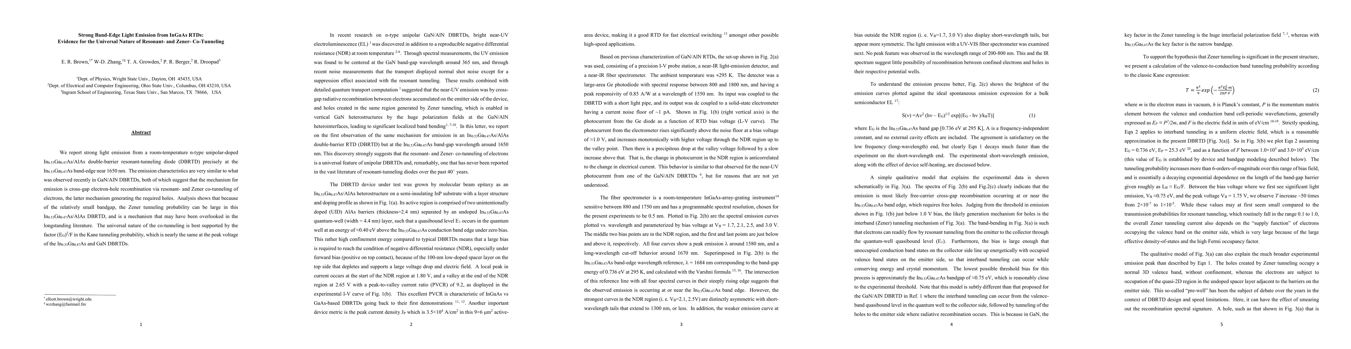 This paper reports strong room-temperature light emission from In0.53Ga0.47As/AlAs double-barrier resonant-tunneling diodes at the band-edge, suggesting a universal mechanism of resonant- and Zener co-tunneling for electron-hole recombination. The similarity in emission characteristics to GaN/AlN diodes supports the overlooked role of Zener tunneling in small bandgap materials.
