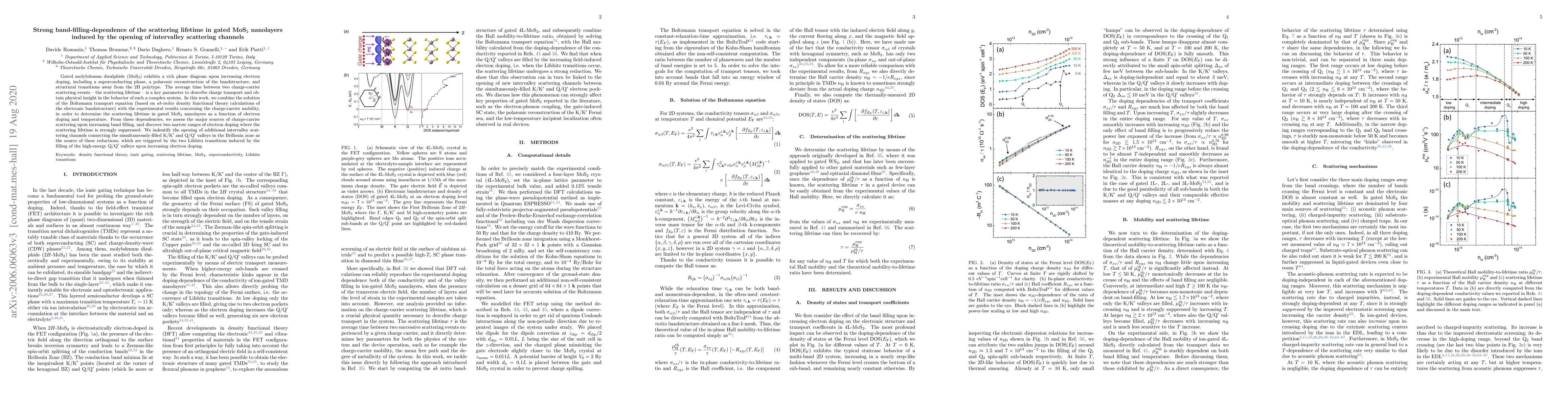 This research determines the scattering lifetime in gated MoS2 nanolayers as a function of electron doping and temperature, identifying two doping ranges with strongly suppressed scattering lifetime. The cause is attributed to the opening of additional intervalley scattering channels connecting K/K' and Q/Q' valleys, triggered by Lifshitz transitions upon electron doping increase.