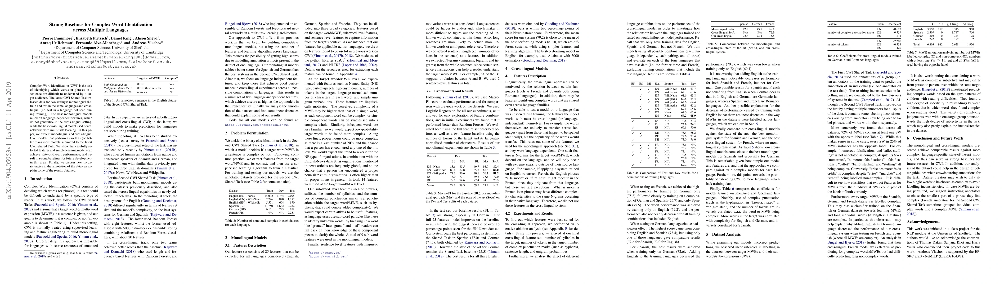 Researchers developed strong baselines for Complex Word Identification across multiple languages, achieving state-of-the-art performance with simple learning models and carefully selected features. Their findings help explain inconsistencies in previous results due to data annotation issues.