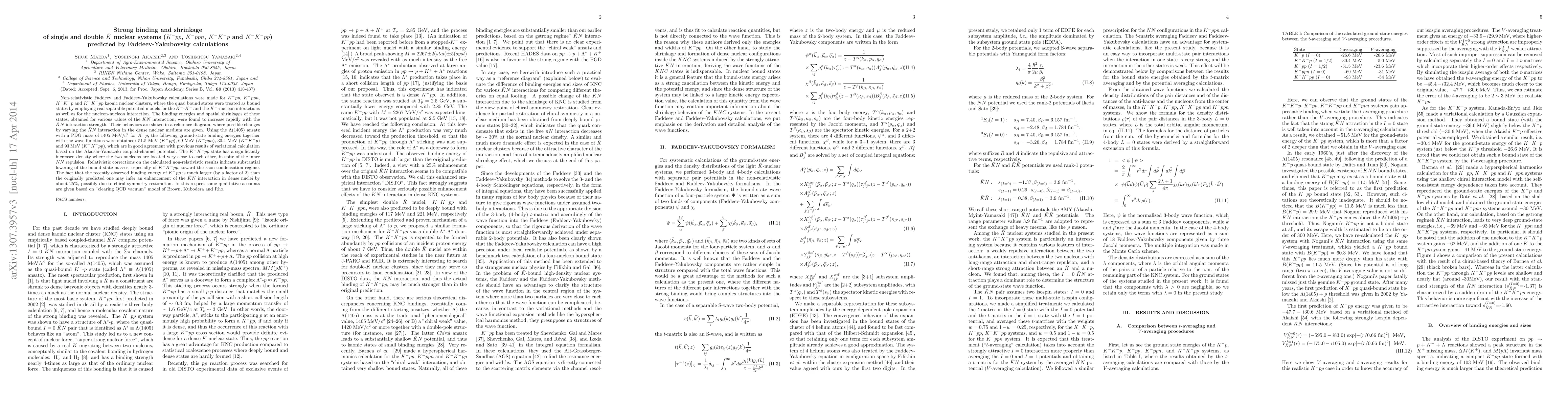 Non-relativistic Faddeev and Faddeev-Yakubovsky calculations were made for K^-pp, K^- ppn, K^-K^-p and K^- K^-pp kaonic nuclear clusters, where the quasi bound states were treated as bound states by employing real separable potential models for the K^ - - K^ - and the K^ - -nucleon interactions as well as for the nucleon-nucleon interaction. The binding energies and spatial shrinkages of these states, obtained for various values of the Kbar N interaction, were found to increase rapidly with the Kbar N interaction strength. Their behaviors are shown in a reference diagram, where possible changes by varying the KbarN interaction in the dense nuclear medium are given. Using the Lambda(1405) ansatz with a PDG mass of 1405 MeV/ c^2 for K^-p, the following ground-state binding energies together with the wave functions were obtained: 51.5 MeV ( K^ - pp ), 69 MeV ( K^ - ppn), 30.4 MeV ( K^ - K^ - p ) and 93 MeV ( K^ -K^ - pp ), which are in good agreement with previous results of variational calculation based on the Akaishi-Yamazaki coupled-channel potential. The K^ - K^ - pp state has a significantly increased density where the two nucleons are located very close to each other, in spite of the inner NN repulsion. Relativistic corrections on the calculated non-relativistic results indicate substantial lowering of the bound-state masses, especially of K^-K^-pp , toward the kaon condensation regime. The fact that the recently observed binding energy of K^-pp is much larger (by a factor of 2) than the originally predicted one may infer an enhancement of the KbarN interaction in dense nuclei by about 25 %, possibly due to chiral symmetry restoration. In this respect some qualitative accounts are given based on "clearing QCD vacuum" model of Brown, Kubodera and Rho.
