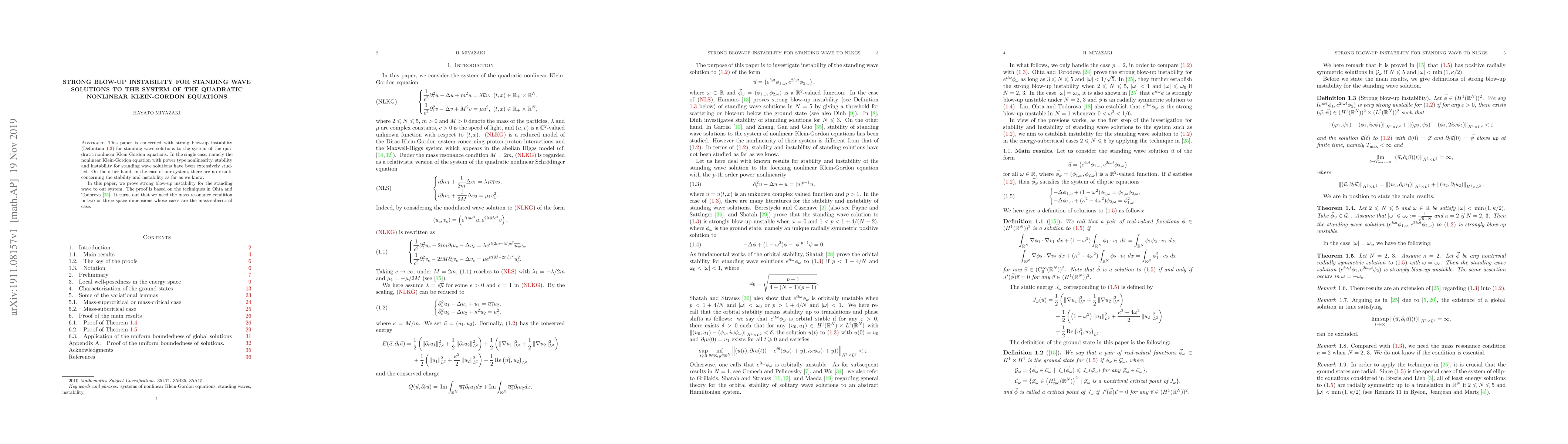 The paper presents detailed proofs of strong blow-up instability for standing wave solutions to the quadratic nonlinear Klein-Gordon system, introducing new techniques and insights into the mass resonance conditions in lower dimensions.