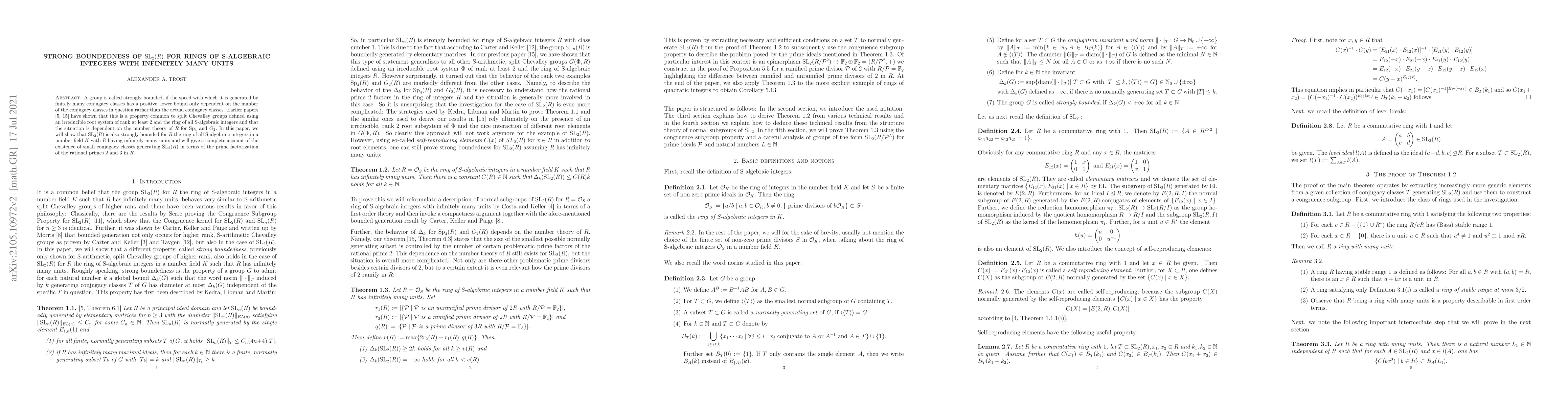 The paper shows that the group SL_2(R) is strongly bounded for rings of S-algebraic integers with infinitely many units, providing a complete account of small conjugacy classes generating the group in terms of prime factorization.