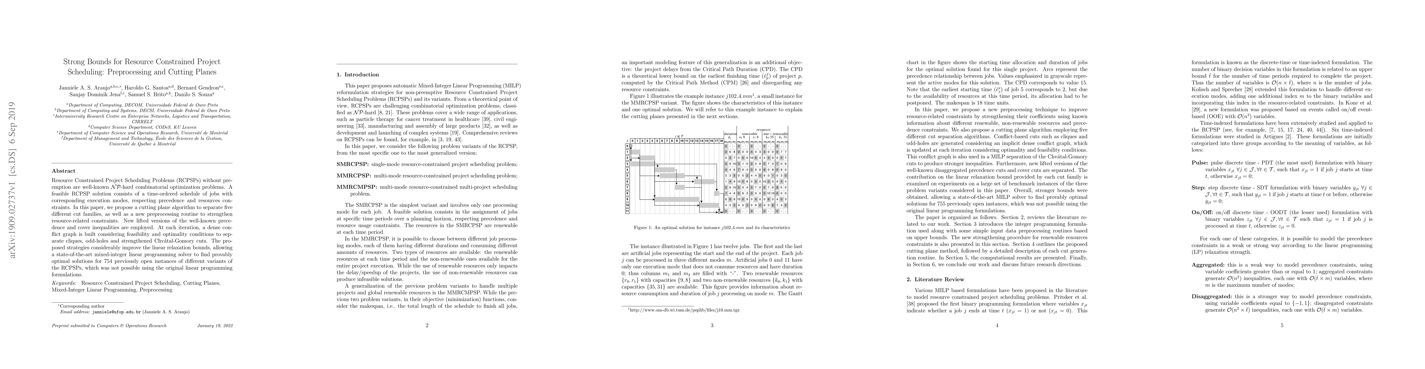This paper introduces a cutting plane algorithm and a new preprocessing routine to enhance bounds for resource-constrained project scheduling problems. The new approach significantly improves linear relaxation bounds, enabling optimal solutions for 754 previously unsolved instances.