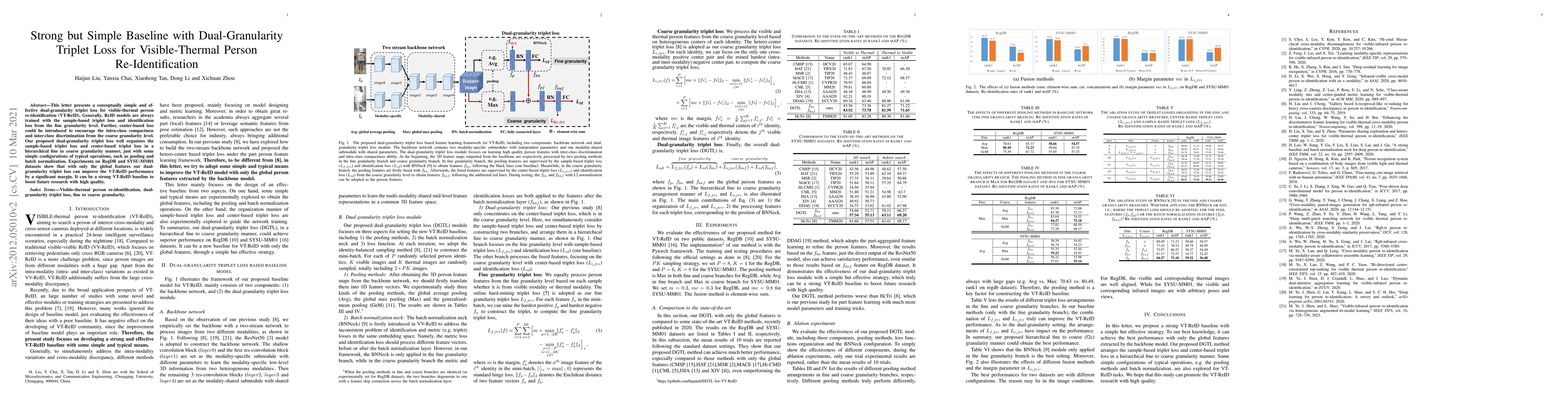 This paper proposes a dual-granularity triplet loss combining fine and coarse granularity levels to enhance visible-thermal person re-identification (VT-ReID) performance. The approach integrates sample-based and center-based losses, achieving significant improvements on RegDB and SYSU-MM01 datasets, establishing a strong baseline for future research.
