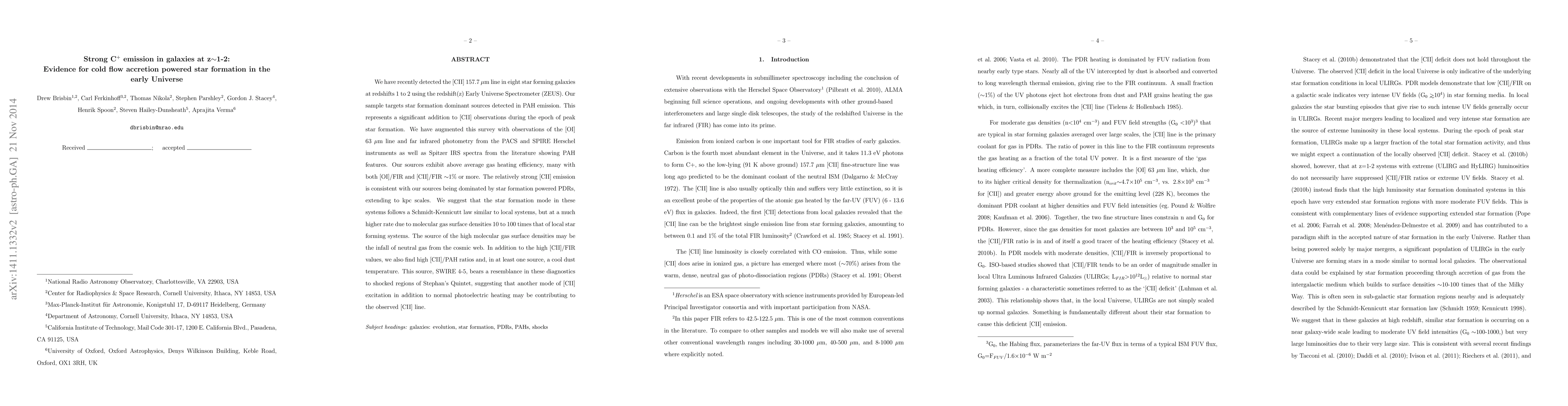 We have recently detected the [CII] 157.7 micron line in eight star forming galaxies at redshifts 1 to 2 using the redshift(z) Early Universe Spectrometer (ZEUS). Our sample targets star formation dominant sources detected in PAH emission. This represents a significant addition to [CII] observations during the epoch of peak star formation. We have augmented this survey with observations of the [OI] 63 micron line and far infrared photometry from the PACS and SPIRE Herschel instruments as well as Spitzer IRS spectra from the literature showing PAH features. Our sources exhibit above average gas heating efficiency, many with both [OI]/FIR and [CII]/FIR ~1% or more. The relatively strong [CII] emission is consistent with our sources being dominated by star formation powered PDRs, extending to kpc scales. We suggest that the star formation mode in these systems follows a Schmidt-Kennicutt law similar to local systems, but at a much higher rate due to molecular gas surface densities 10 to 100 times that of local star forming systems. The source of the high molecular gas surface densities may be the infall of neutral gas from the cosmic web. In addition to the high [CII]/FIR values, we also find high [CII]/PAH ratios and, in at least one source, a cool dust temperature. This source, SWIRE 4-5, bears a resemblance in these diagnostics to shocked regions of Stephan's Quintet, suggesting that another mode of [CII] excitation in addition to normal photoelectric heating may be contributing to the observed [CII] line.