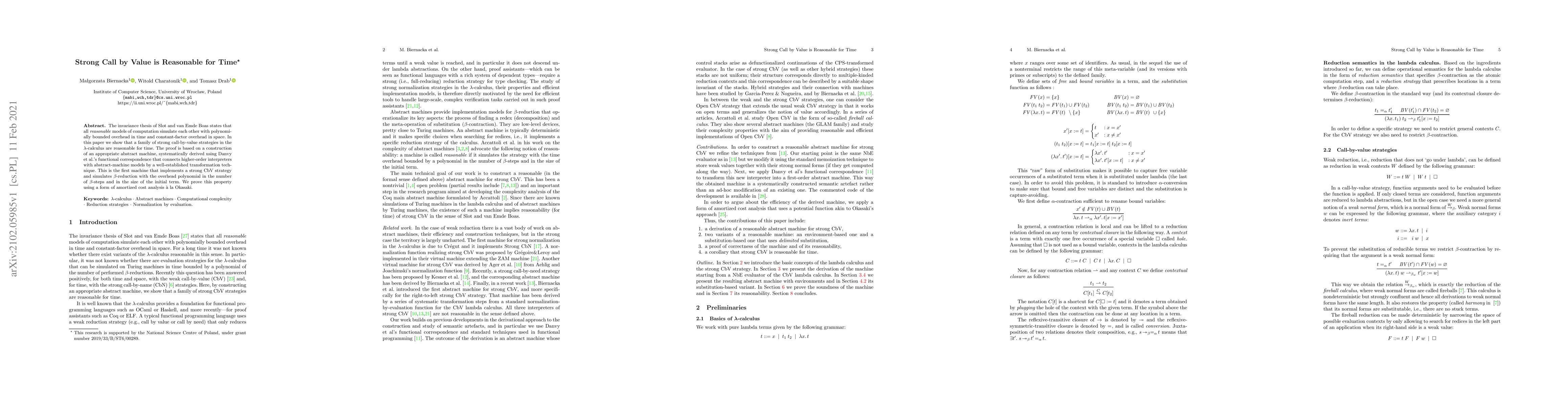 The invariance thesis of Slot and van Emde Boas states that all reasonable models of computation simulate each other with polynomially bounded overhead in time and constant-factor overhead in space. In this paper we show that a family of strong call-by-value strategies in the $\lambda$-calculus are reasonable for time. The proof is based on a construction of an appropriate abstract machine, systematically derived using Danvy et al.'s functional correspondence that connects higher-order interpreters with abstract-machine models by a well-established transformation technique. This is the first machine that implements a strong CbV strategy and simulates $\beta$-reduction with the overhead polynomial in the number of $\beta$-steps and in the size of the initial term. We prove this property using a form of amortized cost analysis \`a la Okasaki.