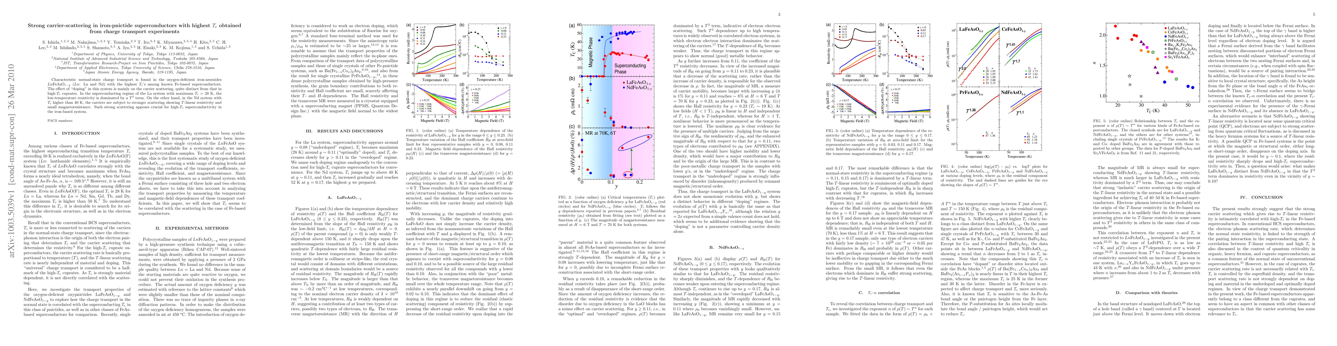 Characteristic normal-state charge transport is found in the oxygen-deficient iron-arsenides LnFeAsO1-y (Ln: La and Nd) with the highest Tc's among known Fe-based superconductors. The effect of "doping" in this system is mainly on the carrier scattering, quite distinct from that in high-Tc cuprates. In the superconducting regime of the La system with maximum Tc = 28 K, the low-temperature resistivity is dominated by a T^2 term. On the other hand, in the Nd system with Tc higher than 40 K, the carriers are subject to stronger scattering showing T-linear resistivity and small magnetoresistance. Such strong scattering appears crucial for high-Tc superconductivity in the iron-based system.