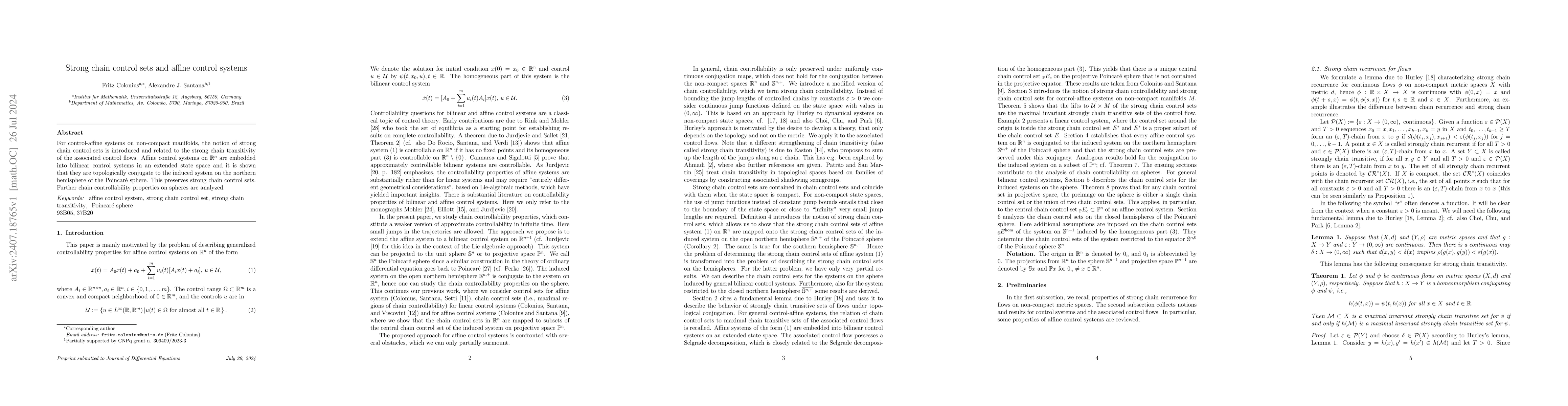 Summary: This paper introduces strong chain control sets for control-affine systems on non-compact manifolds, linking them to control flow transitivity. It embeds affine control systems in an extended space and demonstrates topological conjugacy to systems on the Poincaré sphere, preserving chain controllability.