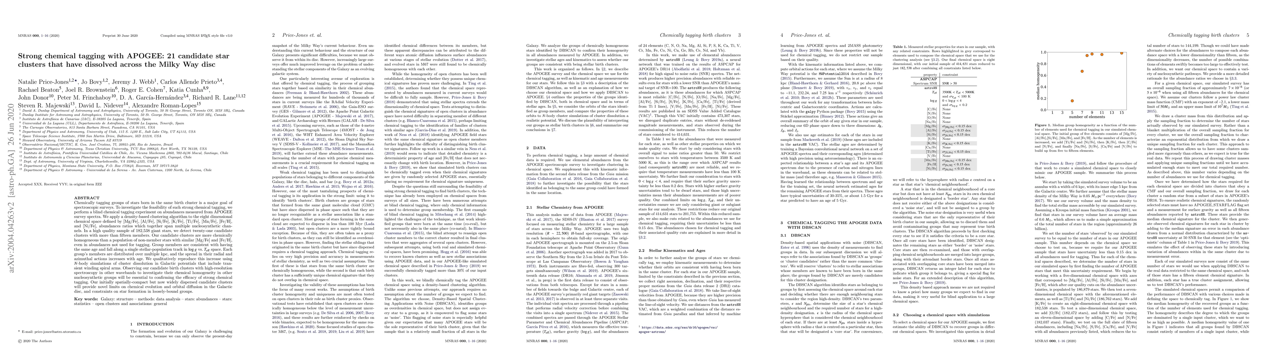 Chemically tagging groups of stars born in the same birth cluster is a major goal of spectroscopic surveys. To investigate the feasibility of such strong chemical tagging, we perform a blind chemical tagging experiment on abundances measured from APOGEE survey spectra. We apply a density-based clustering algorithm to the eight dimensional chemical space defined by [Mg/Fe], [Al/Fe], [Si/Fe], [K/Fe], [Ti/Fe], [Mn/Fe], [Fe/H], and [Ni/Fe], abundances ratios which together span multiple nucleosynthetic channels. In a high quality sample of 182,538 giant stars, we detect twenty-one candidate clusters with more than fifteen members. Our candidate clusters are more chemically homogeneous than a population of non-member stars with similar [Mg/Fe] and [Fe/H], even in abundances not used for tagging. Group members are consistent with having the same age and fall along a single stellar-population track in logg vs. Teff space. Each group's members are distributed over multiple kpc, and the spread in their radial and azimuthal actions increases with age. We qualitatively reproduce this increase using N-body simulations of cluster dissolution in Galactic potentials that include transient winding spiral arms. Observing our candidate birth clusters with high-resolution spectroscopy in other wavebands to investigate their chemical homogeneity in other nucleosynthetic groups will be essential to confirming the efficacy of strong chemical tagging. Our initially spatially-compact but now widely dispersed candidate clusters will provide novel limits on chemical evolution and orbital diffusion in the Galactic disc, and constraints on star formation in loosely-bound groups.