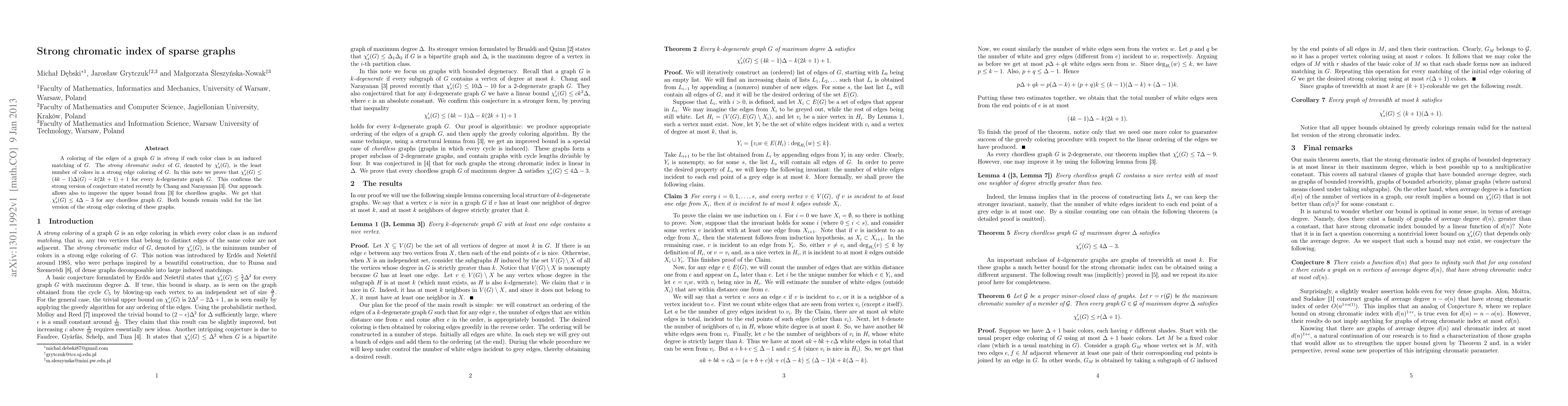 A coloring of the edges of a graph $G$ is strong if each color class is an induced matching of $G$. The strong chromatic index of $G$, denoted by $\chi_{s}^{\prime}(G)$, is the least number of colors in a strong edge coloring of $G$. In this note we prove that $\chi_{s}^{\prime}(G)\leq (4k-1)\Delta (G)-k(2k+1)+1$ for every $k$-degenerate graph $G$. This confirms the strong version of conjecture stated recently by Chang and Narayanan [3]. Our approach allows also to improve the upper bound from [3] for chordless graphs. We get that $% \chi_{s}^{\prime}(G)\leq 4\Delta -3$ for any chordless graph $G$. Both bounds remain valid for the list version of the strong edge coloring of these graphs.