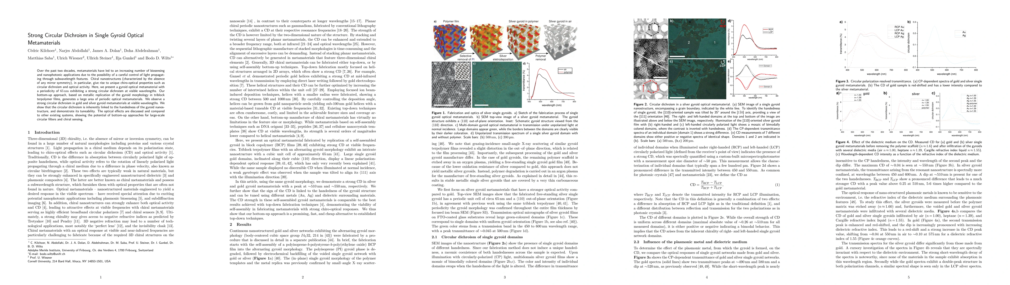 This paper reports on a gyroid optical metamaterial that exhibits strong circular dichroism at visible wavelengths, achieved through a metallic replication of gyroid morphology in triblock terpolymer films. The study demonstrates the inherent link between the gyroid's handedness and its chiro-optical properties, highlighting the potential of bottom-up approaches for scalable chiral sensing and filters.