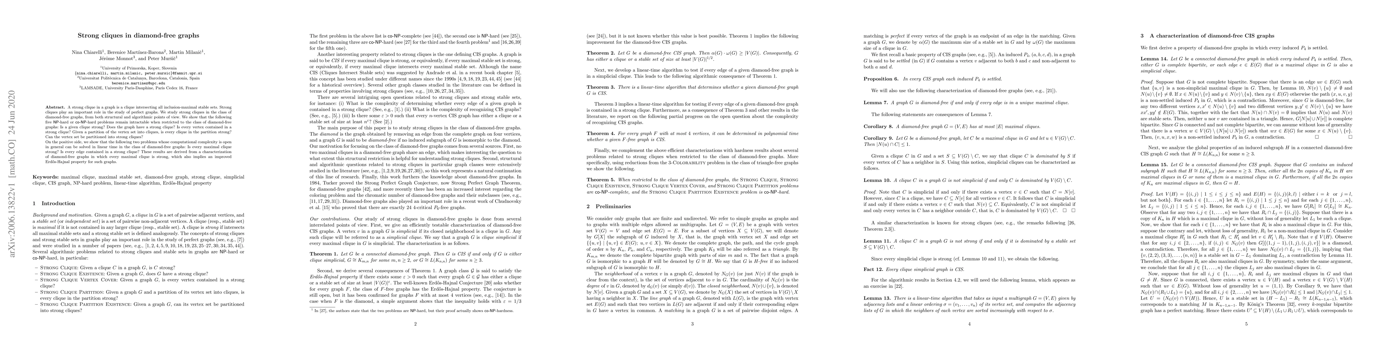 This paper investigates strong cliques in diamond-free graphs, demonstrating that several related problems remain NP-hard or co-NP-hard within this class. However, it provides linear-time solutions for specific problems regarding maximal cliques and edges.