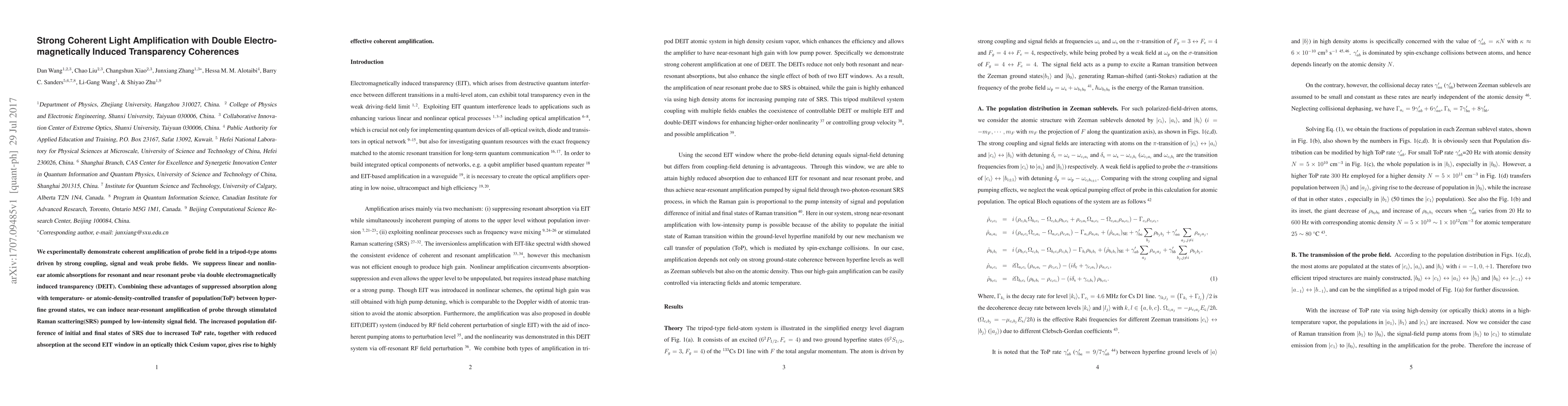 This paper demonstrates coherent amplification of a probe field using double electromagnetically induced transparency (DEIT) in tripod-type atoms, suppressing linear and nonlinear absorptions. Enhanced population transfer between ground states and reduced absorption lead to effective coherent amplification via stimulated Raman scattering.