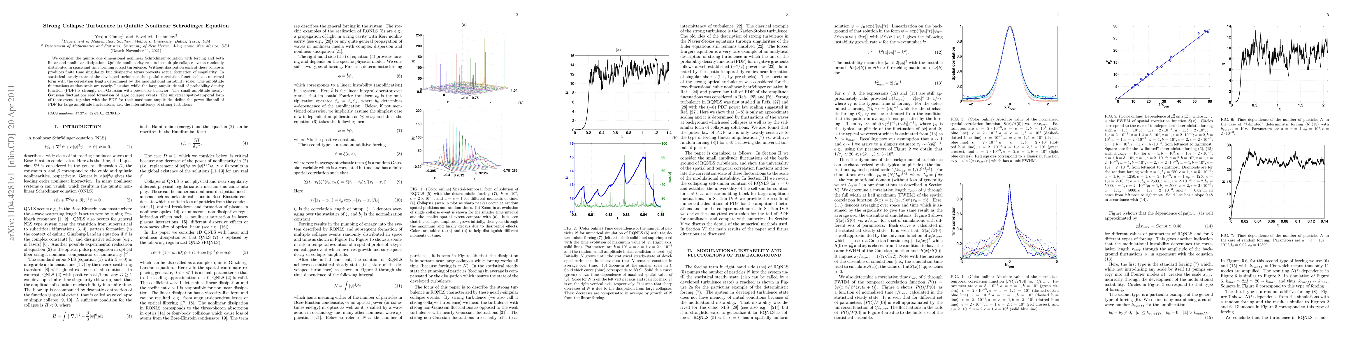 This paper investigates the dynamics of the quintic nonlinear Schrödinger equation with forcing and dissipation, revealing the emergence of strong collapse turbulence and finite time singularities, while dissipation averts actual singularity formation. The study highlights the universal spatial correlation function and the non-Gaussian behavior in the large amplitude tail of the probability density function, driven by nearly-Gaussian small amplitude fluctuations.