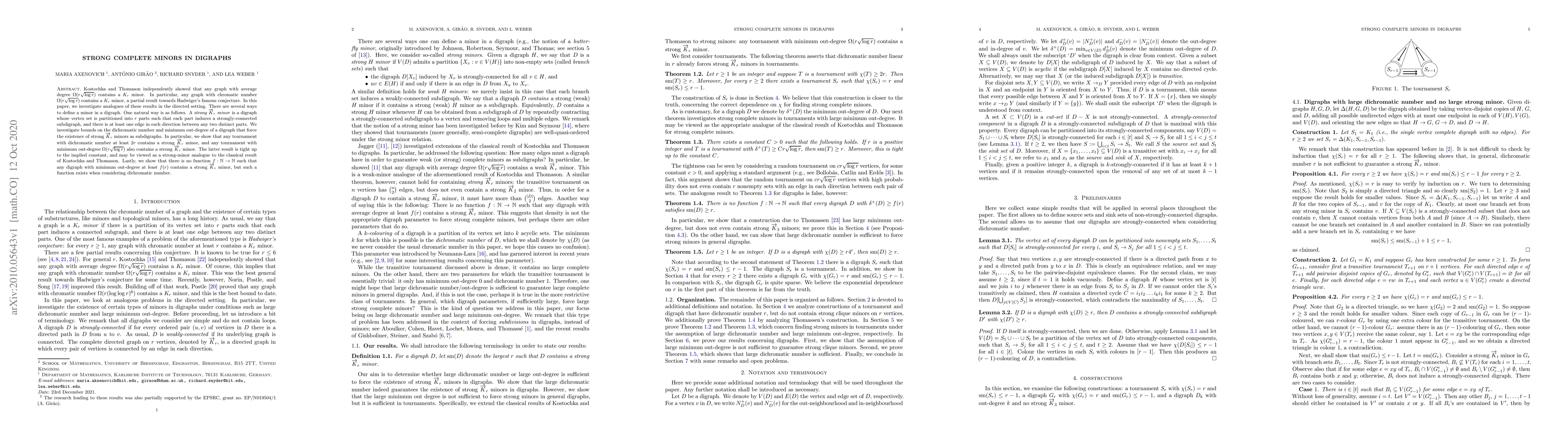 This paper explores directed analogues of results on graph minors, focusing on strong $\overrightarrow{K}_r$ minors in tournaments. It establishes that tournaments with dichromatic number at least $2r$ or minimum out-degree $\Omega(r\sqrt{\log r})$ contain such minors, with the latter result being tight.