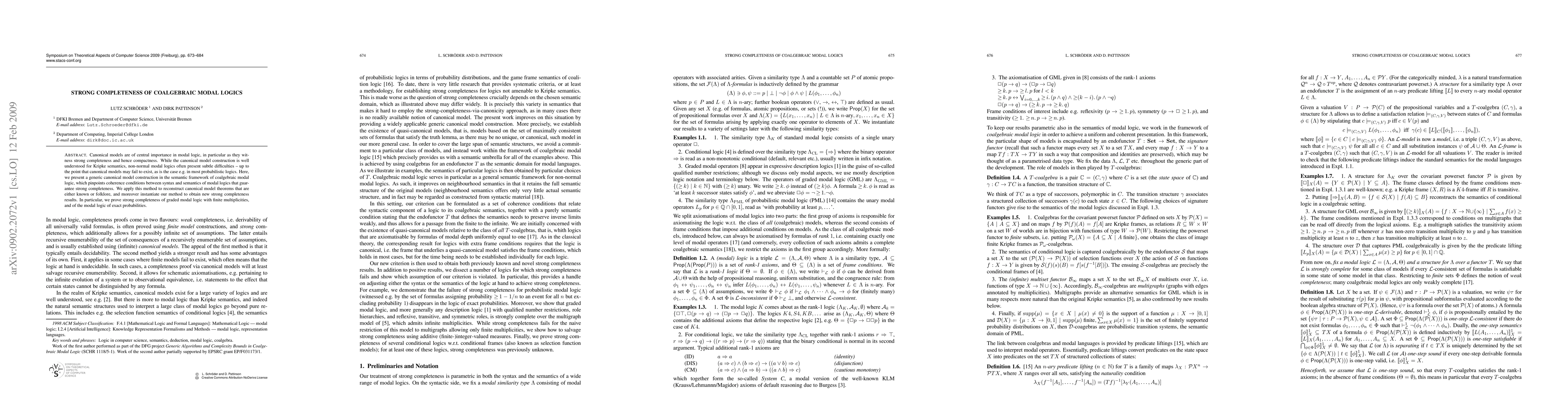 This paper introduces a generic canonical model construction for coalgebraic modal logic, ensuring strong completeness and addressing issues with non-normal modal logics. It applies this method to establish new strong completeness results for graded modal logic and modal logic of exact probabilities.