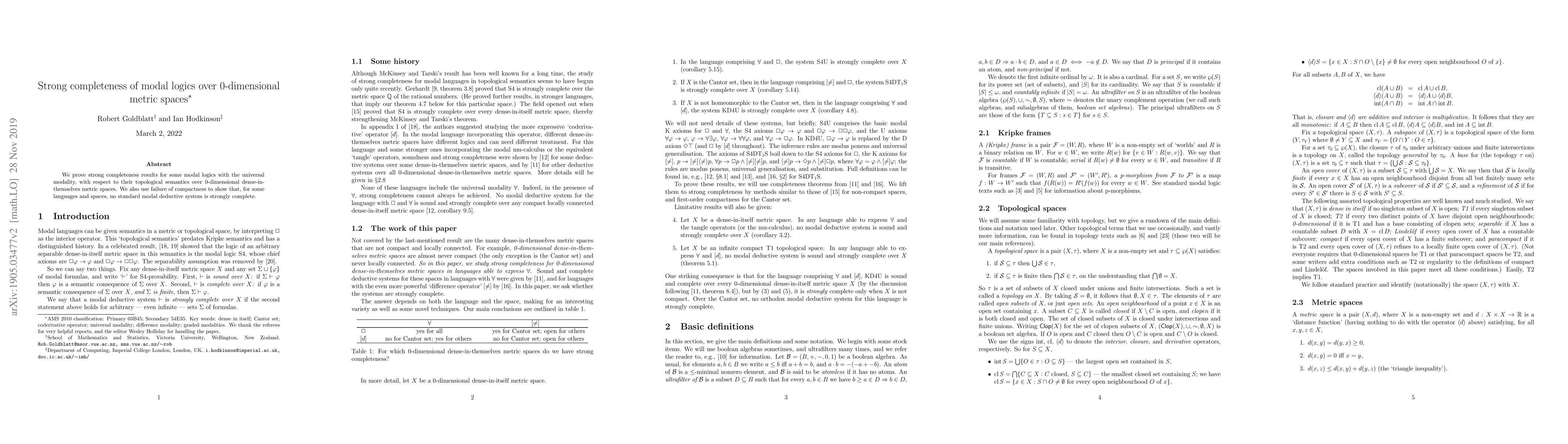This paper establishes strong completeness for certain modal logics with universal modalities when interpreted over 0-dimensional dense-in-themselves metric spaces. It also demonstrates that failure of compactness prevents standard modal deductive systems from achieving strong completeness in some contexts.
