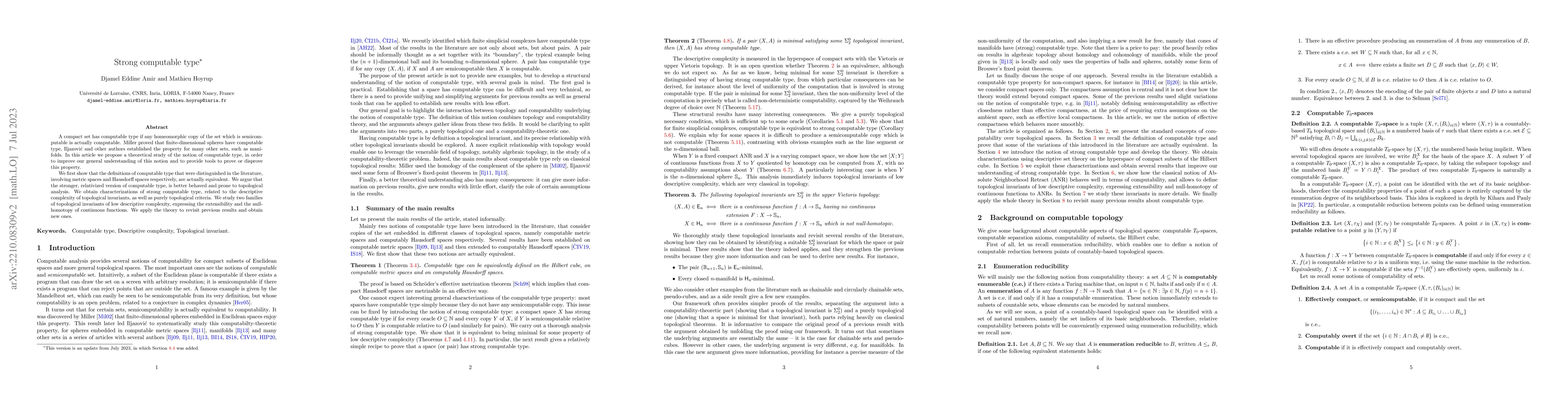 A compact set has computable type if any homeomorphic copy of the set which is semicomputable is actually computable. Miller proved that finite-dimensional spheres have computable type, Iljazovi\'c and other authors established the property for many other sets, such as manifolds. In this article we propose a theoretical study of the notion of computable type, in order to improve our general understanding of this notion and to provide tools to prove or disprove this property. We first show that the definitions of computable type that were distinguished in the literature, involving metric spaces and Hausdorff spaces respectively, are actually equivalent. We argue that the stronger, relativized version of computable type, is better behaved and prone to topological analysis. We obtain characterizations of strong computable type, related to the descriptive complexity of topological invariants, as well as purely topological criteria. We study two families of topological invariants of low descriptive complexity, expressing the extensibility and the null-homotopy of continuous functions. We apply the theory to revisit previous results and obtain new ones.