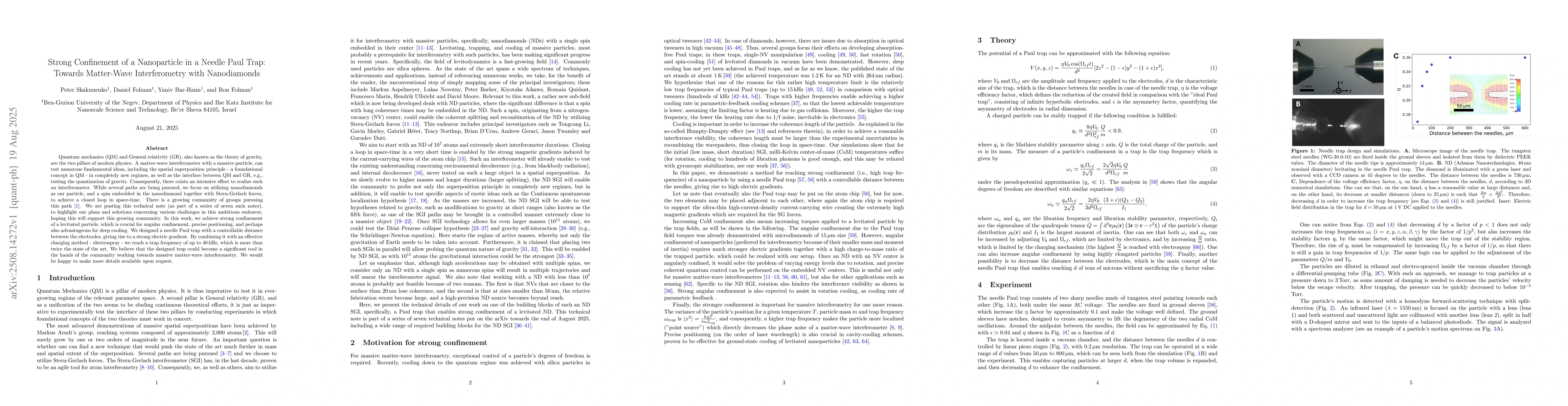 Quantum mechanics (QM) and General relativity (GR), also known as the theory of gravity, are the two pillars of modern physics. A matter-wave interferometer with a massive particle, can test numerous fundamental ideas, including the spatial superposition principle - a foundational concept in QM - in completely new regimes, as well as the interface between QM and GR, e.g., testing the quantization of gravity. Consequently, there exists an intensive effort to realize such an interferometer. While several paths are being pursued, we focus on utilizing nanodiamonds as our particle, and a spin embedded in the nanodiamond together with Stern-Gerlach forces, to achieve a closed loop in space-time. There is a growing community of groups pursuing this path [1]. We are posting this technical note (as part of a series of seven such notes), to highlight our plans and solutions concerning various challenges in this ambitious endeavor, hoping this will support this growing community. In this work, we achieve strong confinement of a levitated particle, which is crucial for angular confinement, precise positioning, and perhaps also advantageous for deep cooling. We designed a needle Paul trap with a controllable distance between the electrodes, giving rise to a strong electric gradient. By combining it with an effective charging method - electrospray - we reach a trap frequency of up to 40 kHz, which is more than twice the state of the art. We believe that the designed trap could become a significant tool in the hands of the community working towards massive matter-wave interferometry. We would be happy to make more details available upon request.