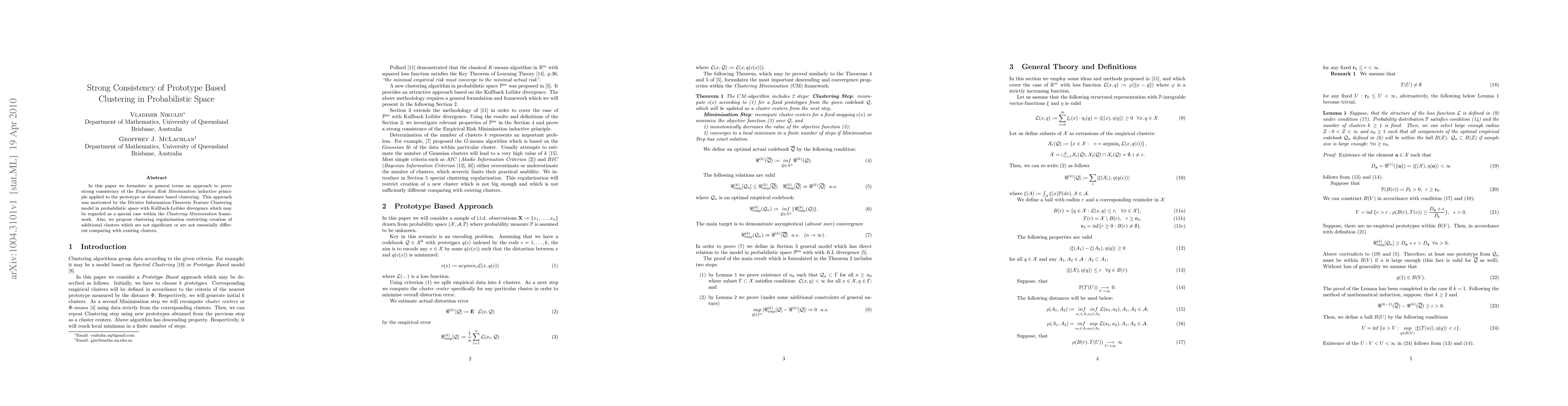 In this paper we formulate in general terms an approach to prove strong consistency of the Empirical Risk Minimisation inductive principle applied to the prototype or distance based clustering. This approach was motivated by the Divisive Information-Theoretic Feature Clustering model in probabilistic space with Kullback-Leibler divergence which may be regarded as a special case within the Clustering Minimisation framework. Also, we propose clustering regularization restricting creation of additional clusters which are not significant or are not essentially different comparing with existing clusters.